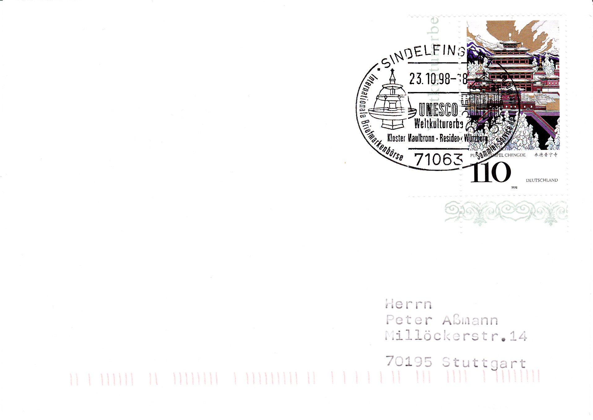 Hier ein vom 23.10.1998 mit der Marke zu 110Pf UNESCO-Welterbe Punig-Tempel in Chengde (MiNr 2008).
