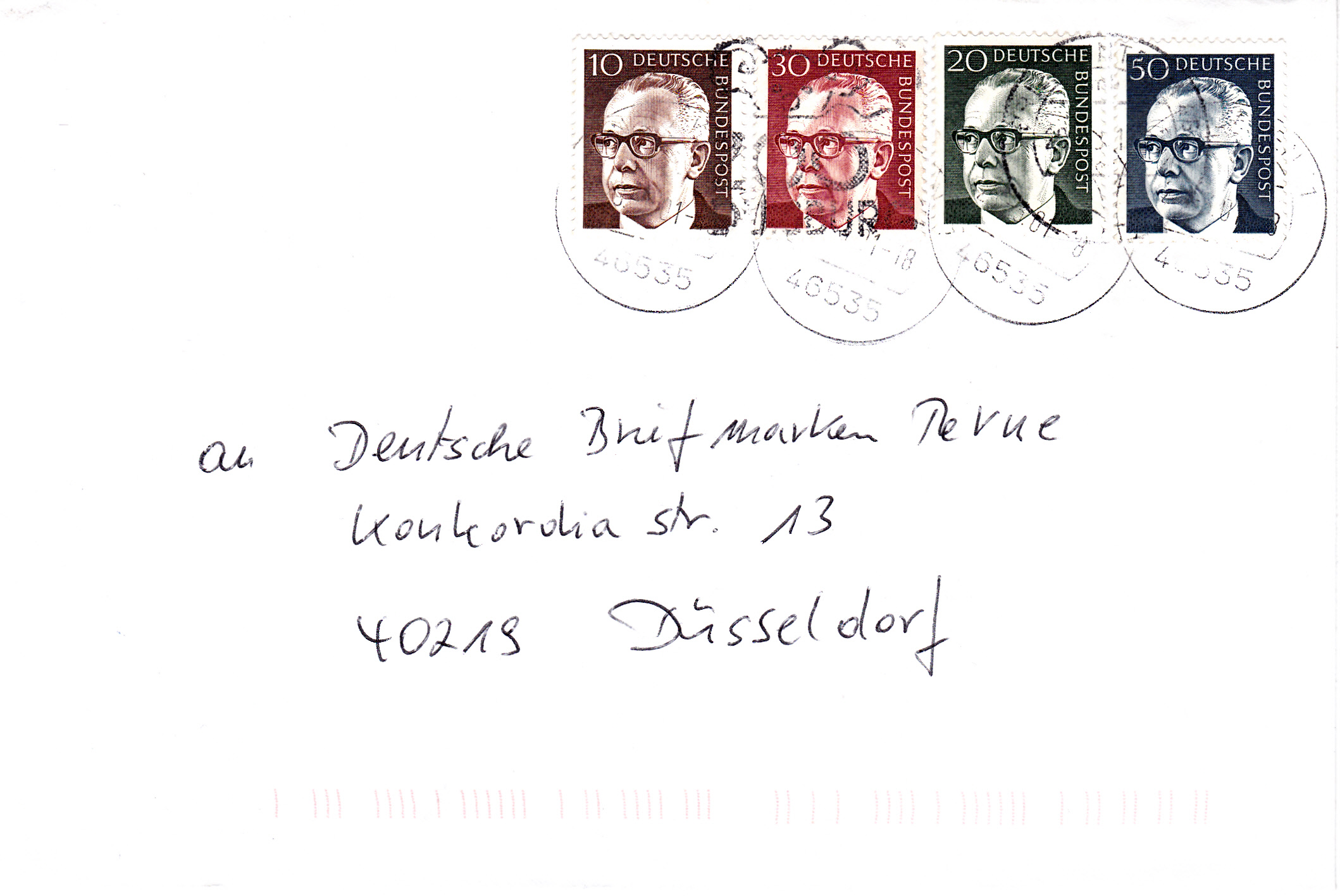 Auf diesem Brief wurden 2001 schnell noch ein paar ältere Marken aus der Heinemann-Serie aufgebraucht, ehe sie nach der Euro-Einführung ungültig werden konnten.