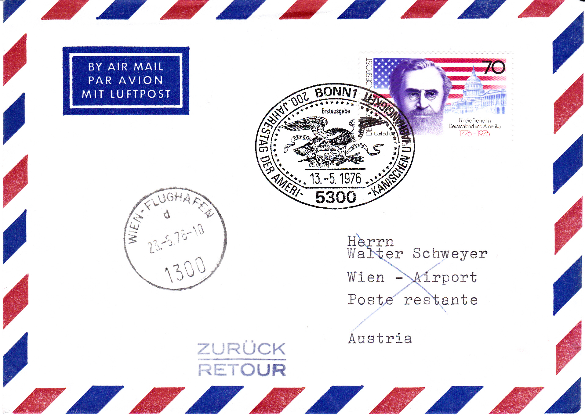 Brief von Bonn nach Wien vom 13.5.1976. Da der Brief postlagernd beim Flughafen Wien verschickt wurde und dort in der Lagerfrist nicht abgeholt wurde, trat er am 23.5.1976 die Rückreise an.