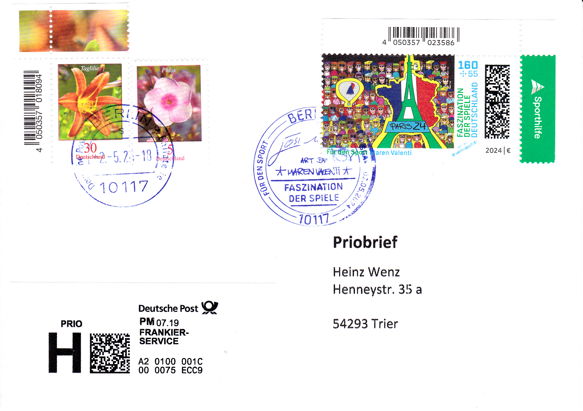 Dieser Brief wurde mit der Marke "Demokratie" zu 85 Cent (MiNr 3769) frankiert. und in einer Postagentur als Priobrief aufgegeben. Offensichtlich war der Mitarbeiter der Postagentur zunächst mit dem Priobrief "überfordert". Er druckte ein Label "Priobrief" mit dem Wert 0,25€ aus. Er dachte wohl, dass der Priobrief insgesamt 1,10€ kostet. Er bemerkt dann wohl seinen Fehler (Der ZUSCHLAG zum Briefporto beträgt 1,10€) und fertigte noch ein zusätzliches Label zu 0,85€ aus.