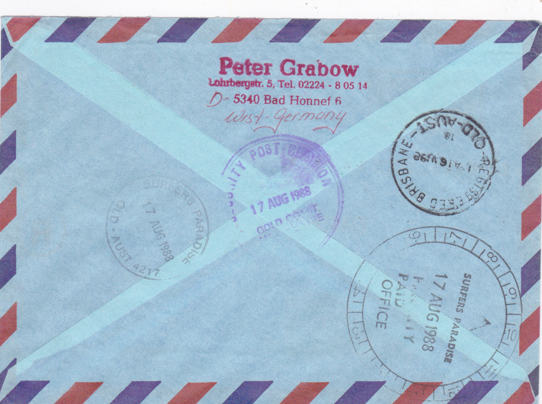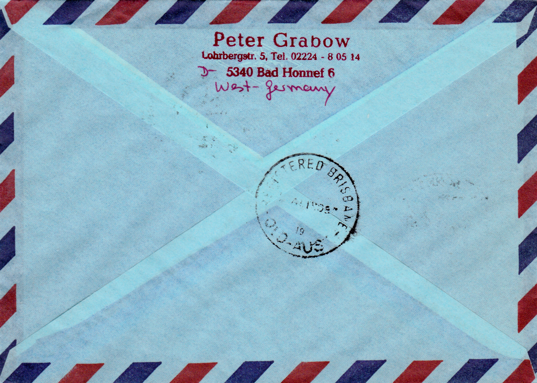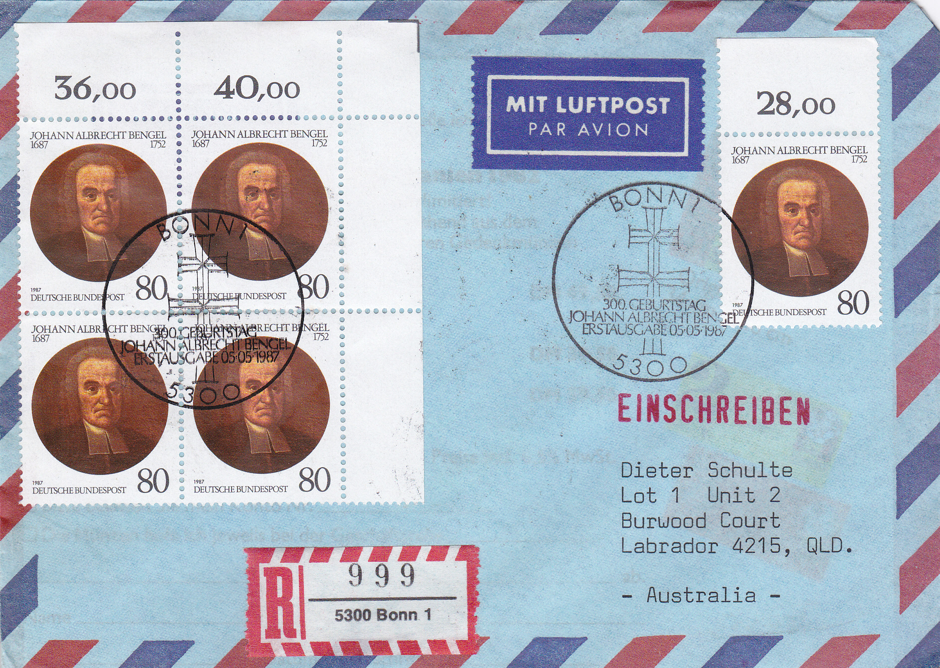 Luftpost-Einschreiben (bis 10g) vom 5.5.1987 von Bonn nach Australien mit einer Mehrfachfrankatur der Marke "300. Geburtstag von Johann Albrecht Bengel" (MiNr 1324) mit dem Ersttagsonderstempel Bonn. Das Porto betrug: Auslandbrief (bis 20g) 120Pf, Einschreiben 200Pf, Zuschlag für Luftpost 6-10g nach Australien je 5g 40Pf, (2x 40Pf = 80Pf) zusammen also 400Pf.