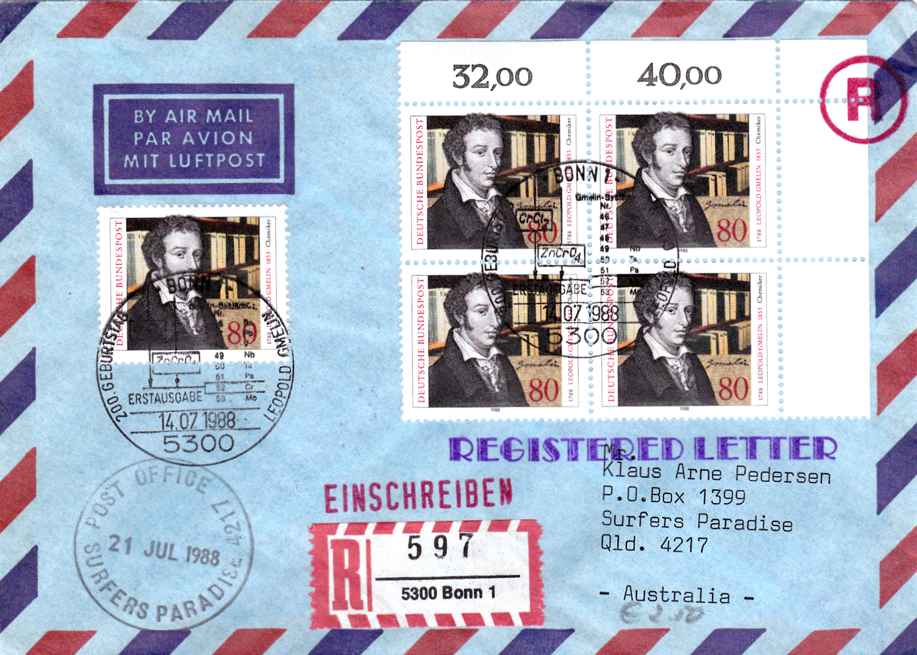 Luftpost-Einschreiben (bis 10g) von Bonn nach Australien mit einer Mehrfachfrankatur der Marke "200. Geburtstag von Leopold Gmelin" mit dem Ersttagsonderstempel Bonn. Das Porto betrug: Auslandbrief (bis 20g) 120Pf, Einschreiben 200Pf, Zuschlag für Luftpost 6-10g nach Australien je 5g 40Pf, (2x 40Pf = 80Pf) zusammen also 400Pf.