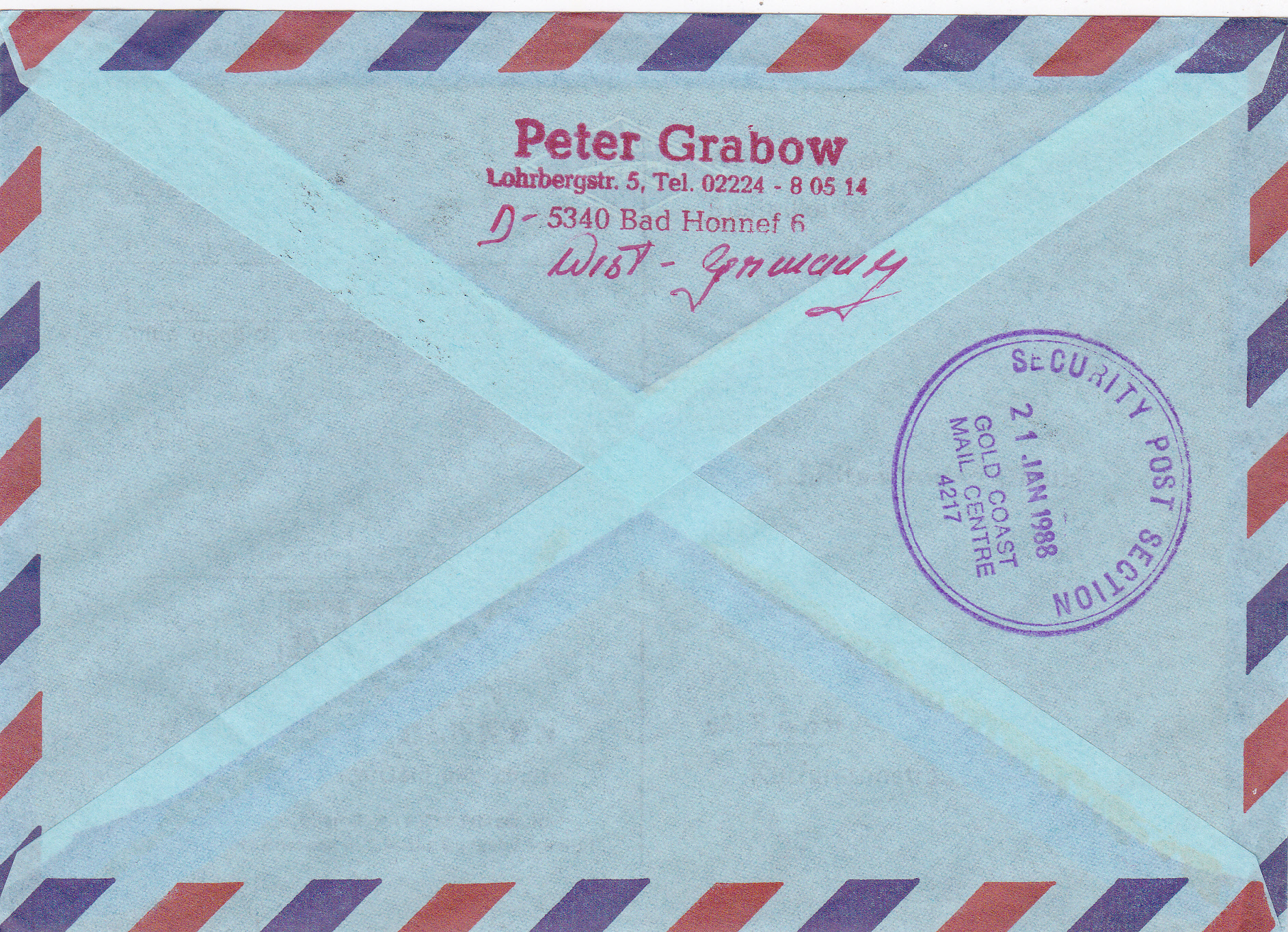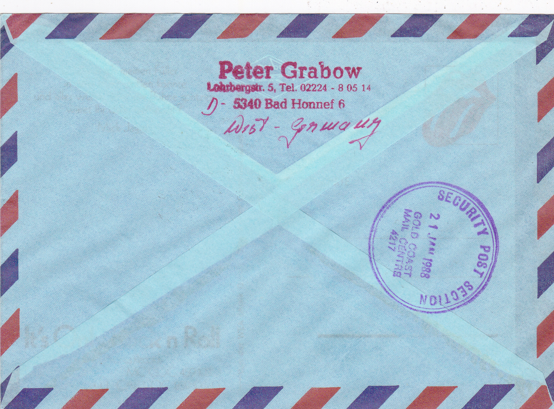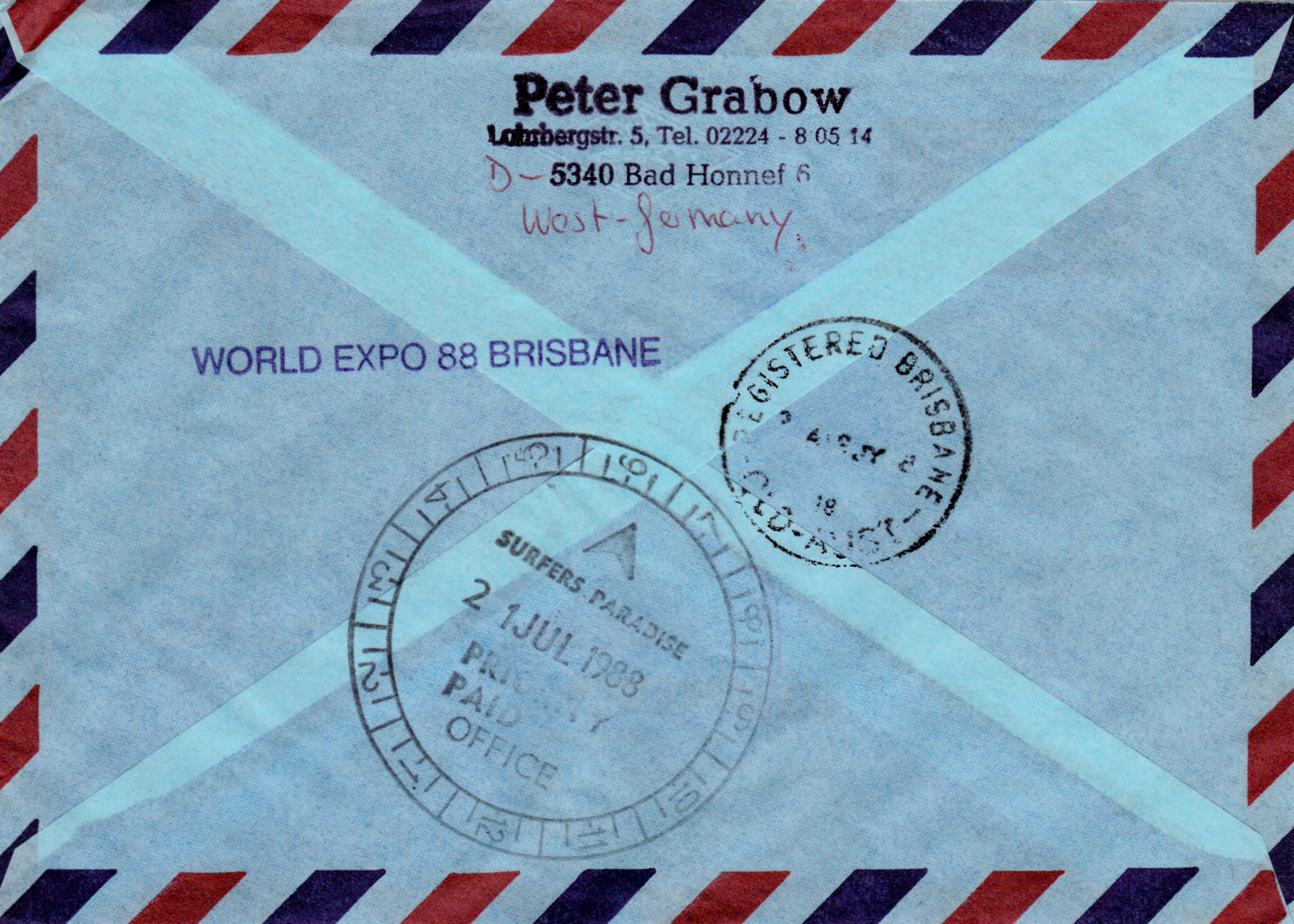 Luftpost-Einschreiben (bis 10g) vom 14.1.1988 von Bonn nach Australien mit einer Mehrfachfrankatur der Marke "Seligsprechung von Edith Stein und Pater Rupert Mayer durch Papst Johannes Paul II." (MiNr 1352) mit dem Ersttagsonderstempel Bonn. Das Porto betrug: Auslandbrief (bis 20g) 120Pf, Einschreiben 200Pf, Zuschlag für Luftpost 6-10g nach Australien je 5g 40Pf, (2x 40Pf = 80Pf) zusammen also 400Pf.