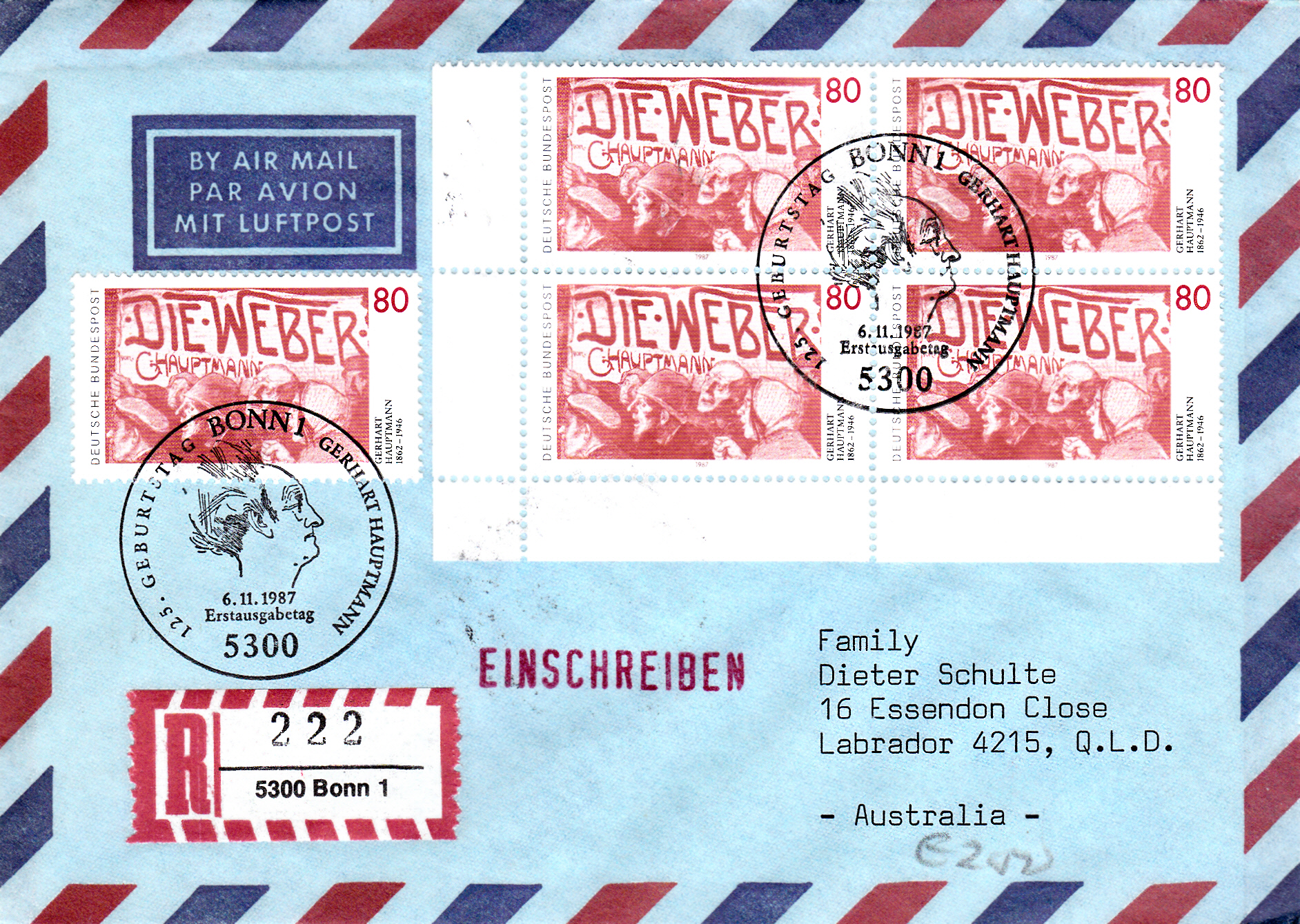 Portogerechter Brief mit Einschreiben und Luftpost nach Australien mit Mehrfachfrankatur mit der Marke zum 125. Geburtstag Hauptmanns (MiNr 1344) und Ersttagstempel Bonn. Das Porto betrug: Auslandbrief (bis 20g) 120Pf, Einschreiben 200Pf, Zuschlag für Luftpost 6-10g nach Australien je 5g 40Pf, (2x 40Pf = 80Pf) zusammen also 400Pf.