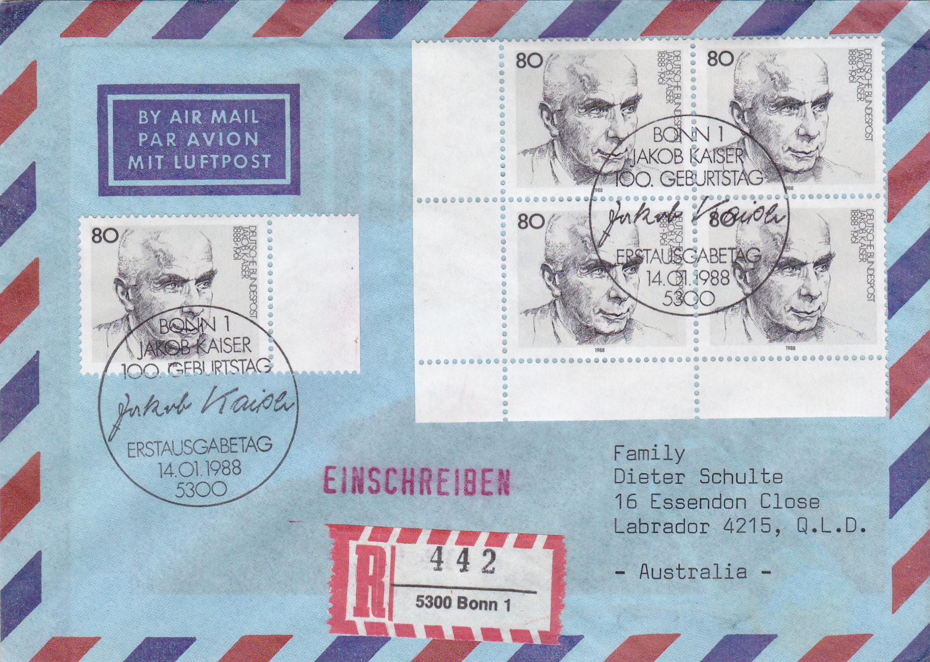 Luftpost-Einschreiben (bis 10g) von Bonn nach Australien mit einer Mehrfachfrankatur der Marke "100. Geburtstag von Jakob Kaiser" mit dem Ersttagsonderstempel Bonn. Das Porto betrug: Auslandbrief (bis 20g) 120Pf, Einschreiben 200Pf, Zuschlag für Luftpost 6-10g nach Australien je 5g 40Pf, (2x 40Pf = 80Pf) zusammen also 400Pf.