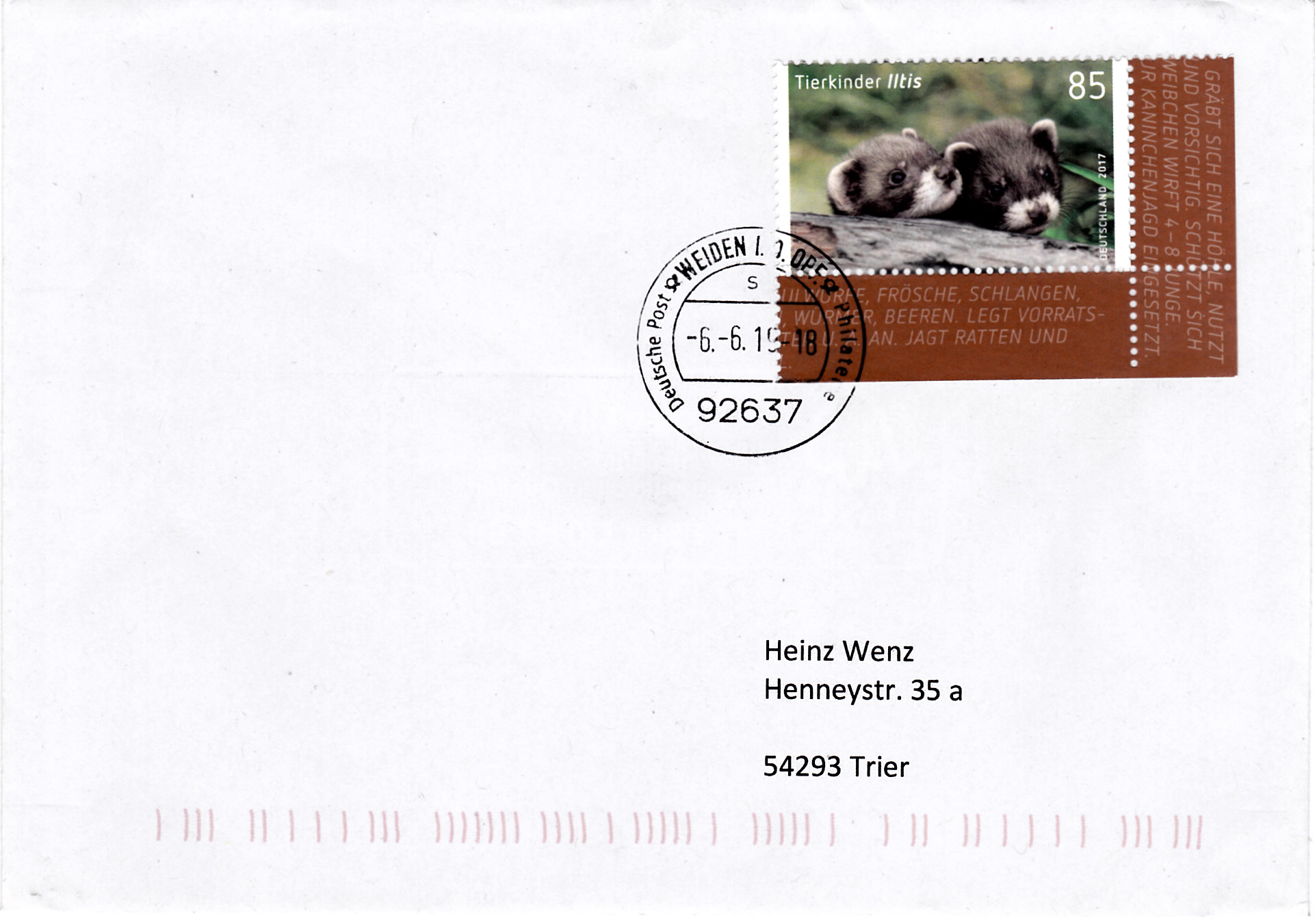 Ein Brief von 21bis 50g im Standardformat kostete vom 1.1.2015 bis zum 30.6.2019 85 Cent. Dieser Brief wurde am 6.6.2019 von Weiden nach Trier verschickt und war portogerecht mit einer Marke zu 85 Cent frankiert.