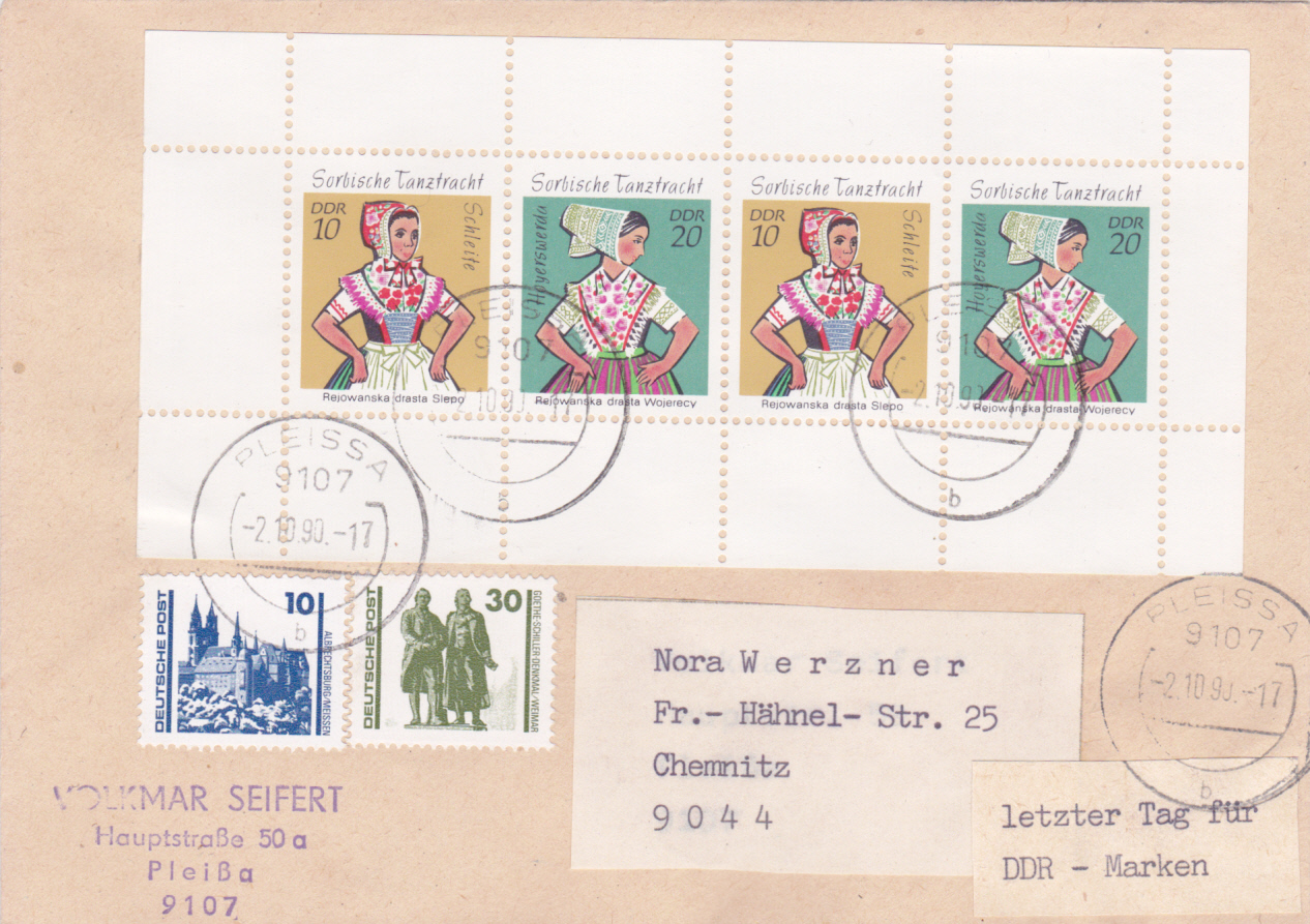 Brief von Pleißa nach Chemnitz vom letzten Gültigkeitstag der Marken in DDR-Währung mit einem Heftchenblatt der Ausgabe "Sorbische Mädchen-Tanztrachten" 1971 (H-Blatt-MiNr 13 I A) und je einer Marken in DM-Währung zu 10 Pfennig (MiNr 3344) und 30 Pfennig (MiNr 3345).