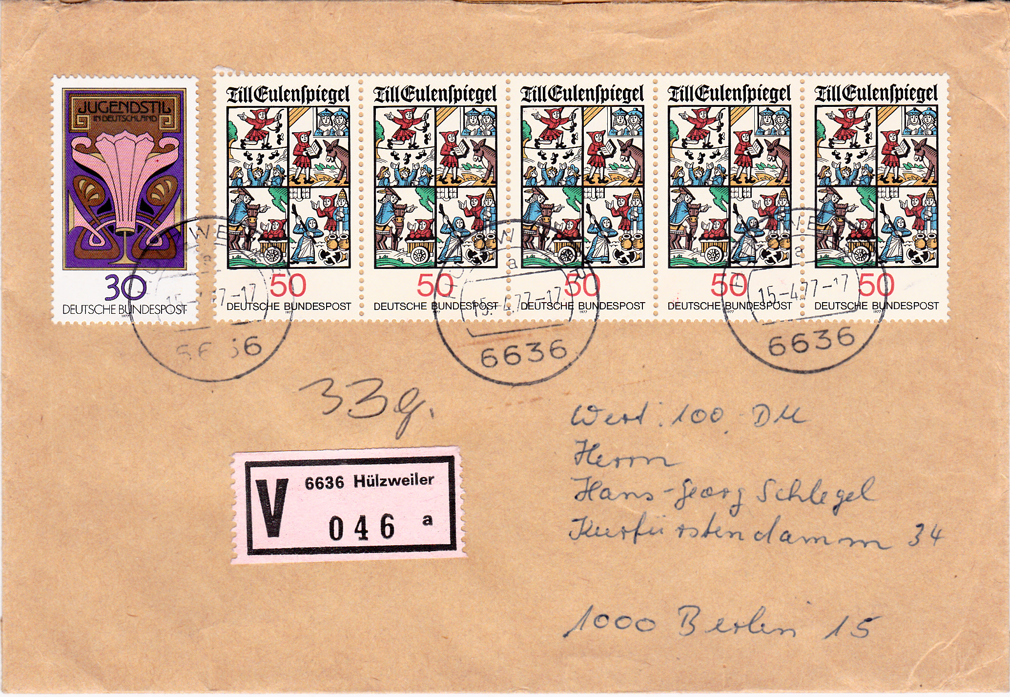 Dieser Brief wog 33g und wurde am 15.4.1977 mit einer Wertangabe von 100 DM von Hülzweiler nach Berlin verschickt. Das Porto bis 50g betrug 80Pf und die Gebühr für eine Wertangabe bis 500 DM 200Pf, zusammen 280Pf. Es wurde mit fünf Marken "Till Eulenspiegel" zu je 50Pf (MiNr 922) und einer Marke aus dem Jugendstilblock zu 30Pf (MiNr 923) entrichtet.