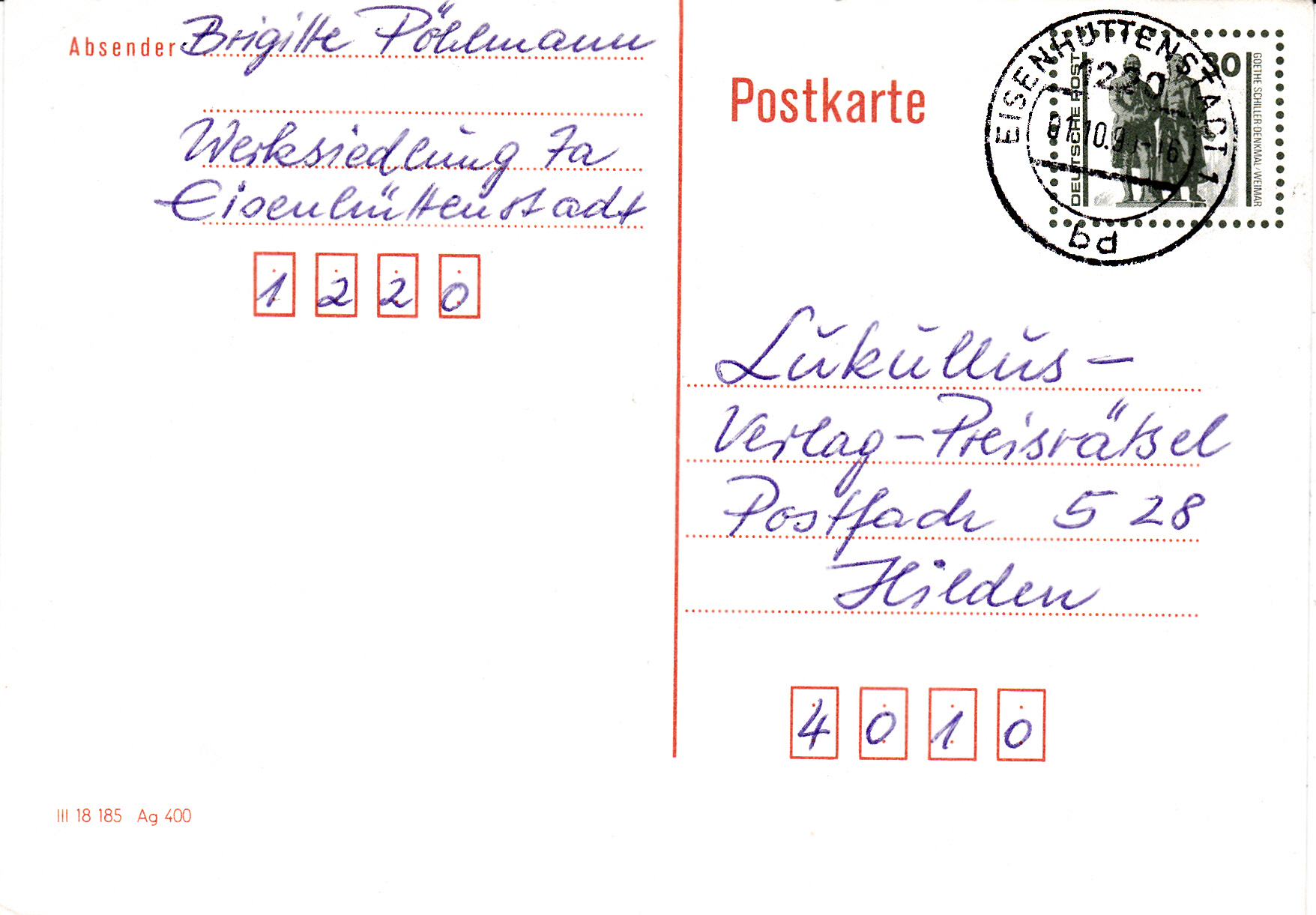 Diese Postkarte, eine Ganzsache mit dem Wertzeicheneindruck 30Pf (MiNr P 147), wurde am 26.2.1991 im VGO aufgegeben und mit einem Bahnpoststempel entwertet.