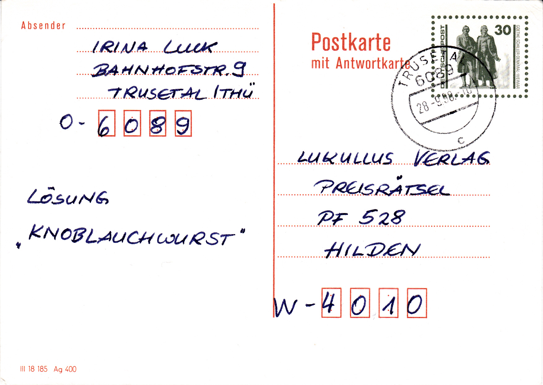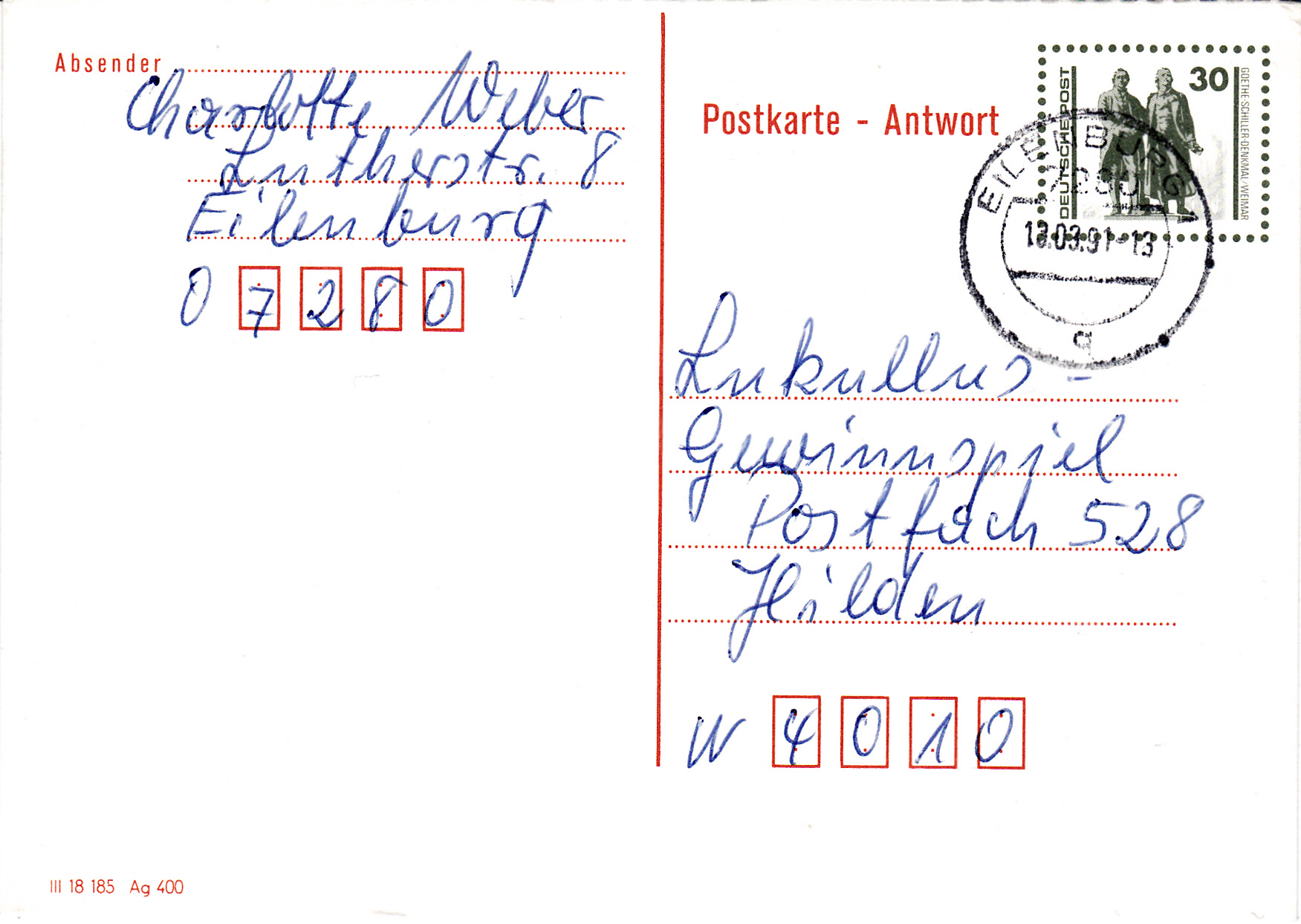 Nach der Einführung der DM am 1.7.1990 galten im sogenannten Verkehrsgebiet Ost vom 1.7.1990 bis zum 31.3.1991 eigene Posttarife. Für eine Postkarte betrug das Porto 30Pf.