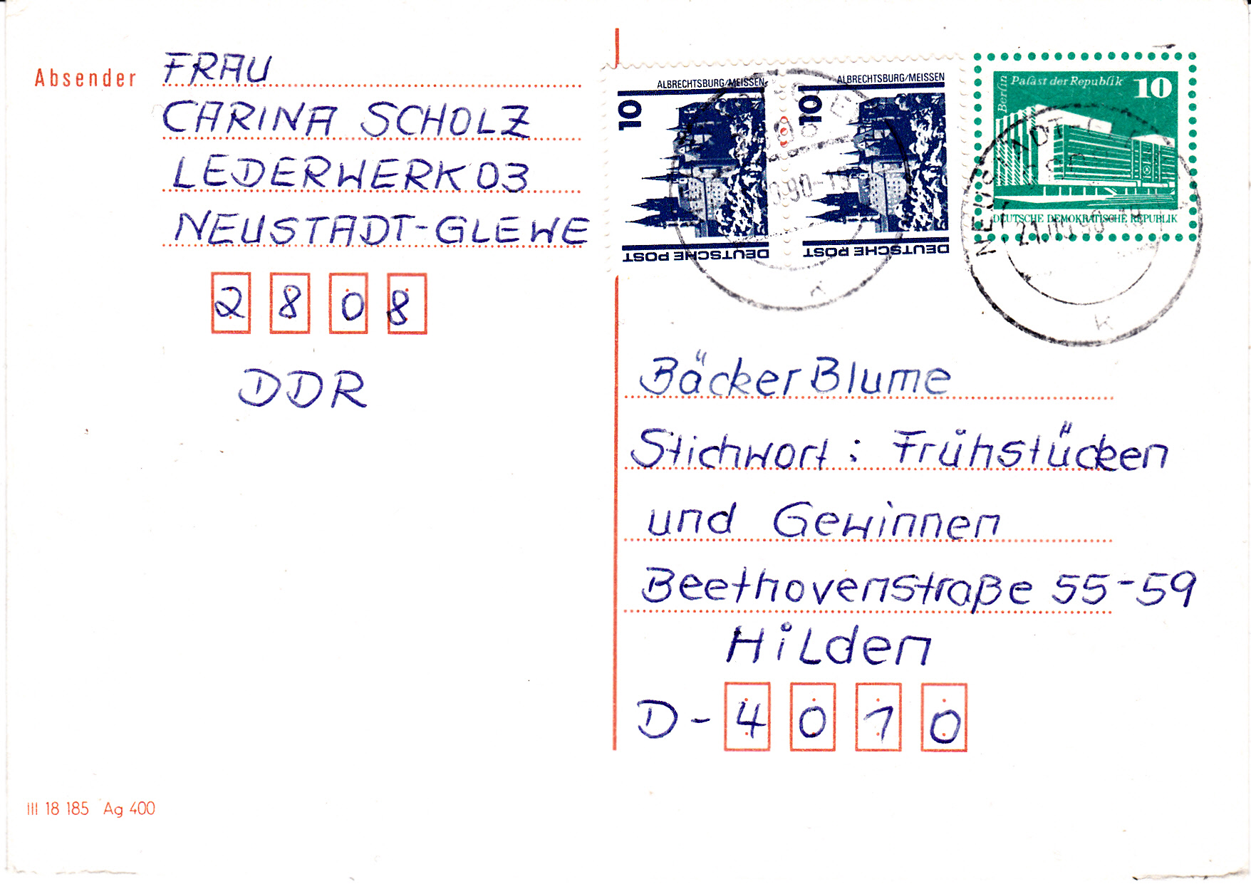 Nach der Einführung der DM am 1.7.1990 galten im sogenannten Verkehrsgebiet Ost vom 1.7.1990 bis zum 31.3.1991 eigene Posttarife. Für eine Postkarte betrug das Porto 30Pf.