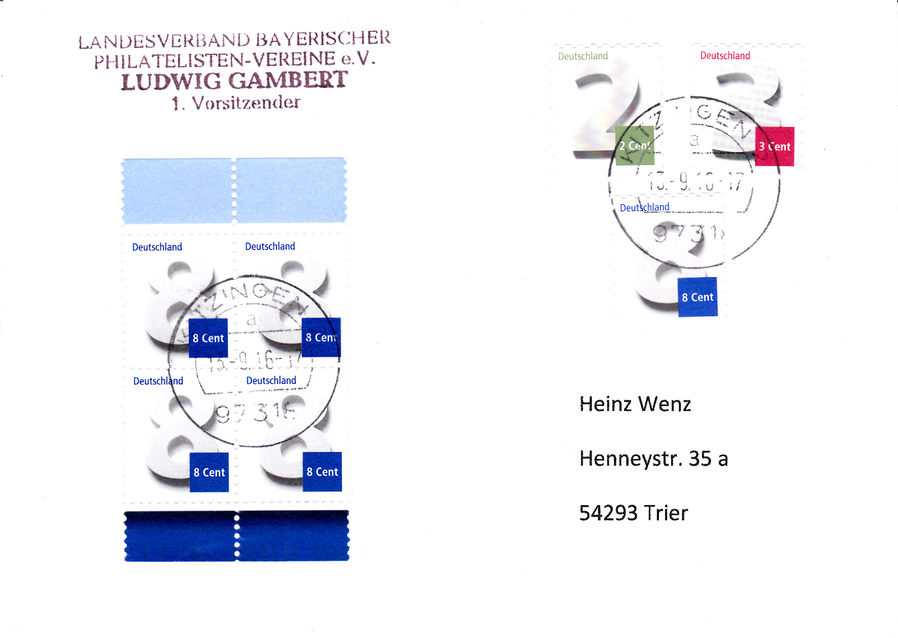 Diese Postkarte vom 13.9.2016 wurde nur mit Marken mit kleinem Nennwert frankiert: vier Marken zu je 8 Cent (MiNr 3188) und je eine selbstklebende Marke zu 8 Cent (MiNr 3196), zu 2 Cent (MiNr 3045) und zu 3 Cent (MiNr 2967).