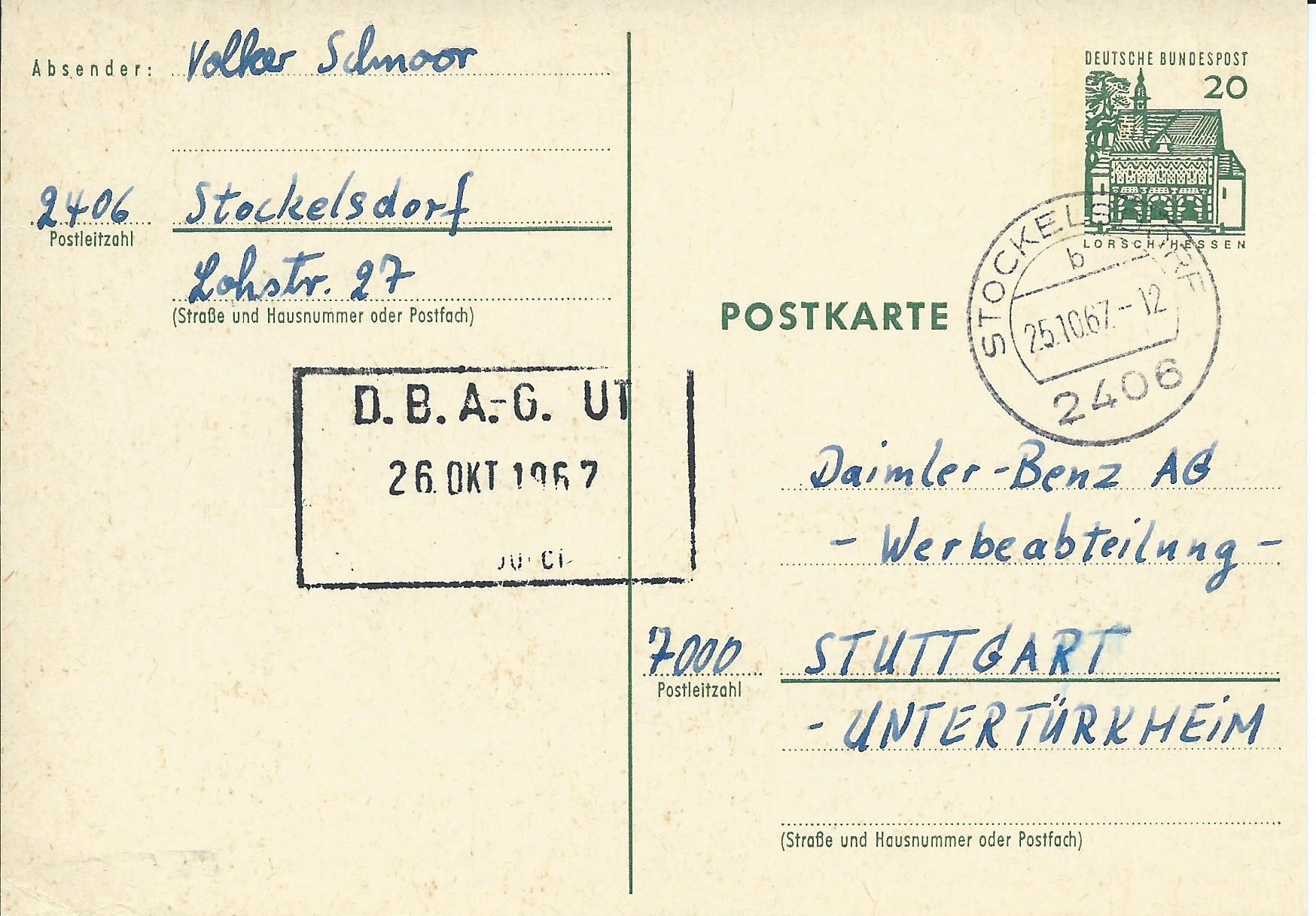 in der Wertstufe 20 Pf sind auch Postkarten als Ganzsache verausgabt worden. Hier eine mit dem Wertstempel kleine Bauwerke 20 Pf, abgestempelt in Stockelsdorf am 27.10.67.