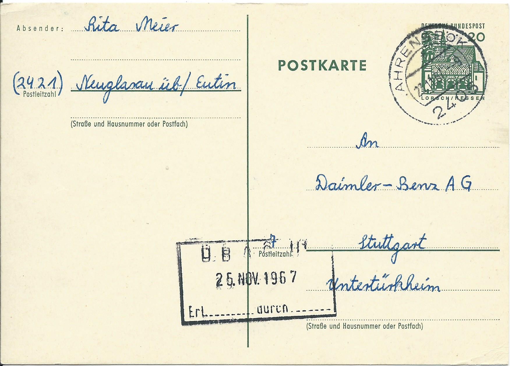 Und eine weitere dieser Ausgabe 20 Pf-Wert kleine Bauwerke, hier gestempelt am 23.11.67 in Ahrensbök. Bei diesen beiden Ganzsachen ist ein kleiner Unterschied festzustellen: Vergleicht mal die Höhe des Schriftzuges „Postkarte“!