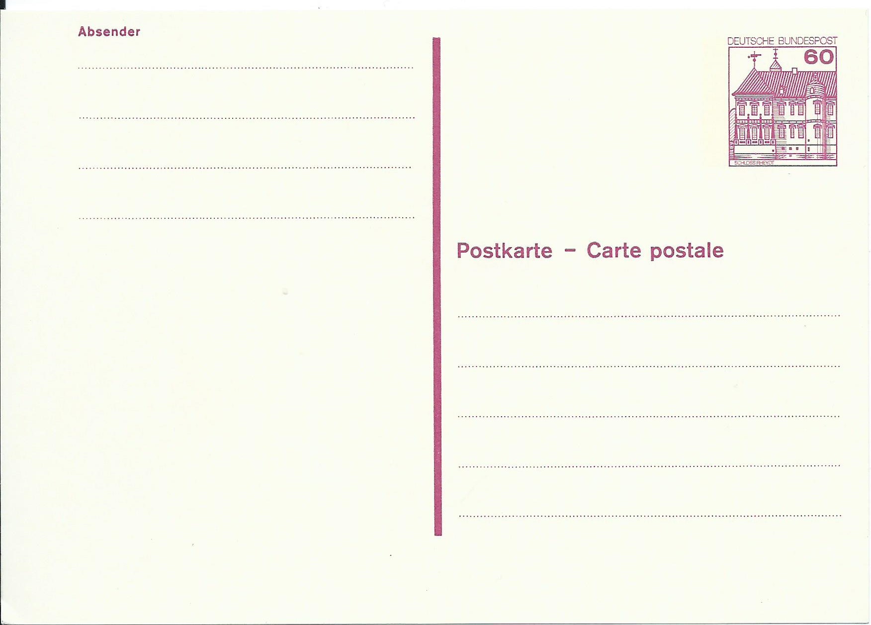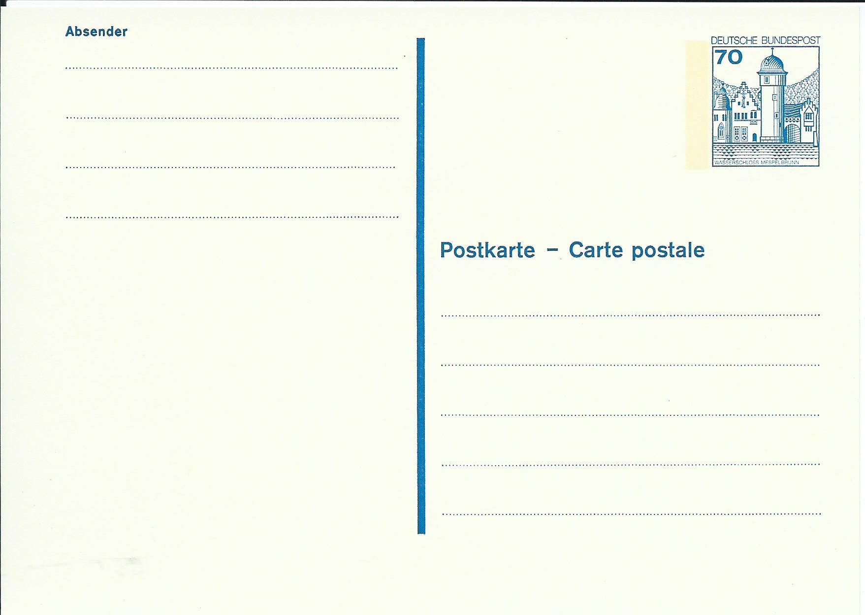 von der Deutschen Bundespost wurden auch Auslandspostkarten als Ganzsache verausgabt. Zeigen kann ich hier eine ungebrauchte der Ausgabe Burgen und Schlösser mit Wertstempel zu 60 Pf mit dem Motiv Schloss Rheydt. Sie war für den Tarifzeitraum vom 1.1.79 – 30.6.82 bestimmt.