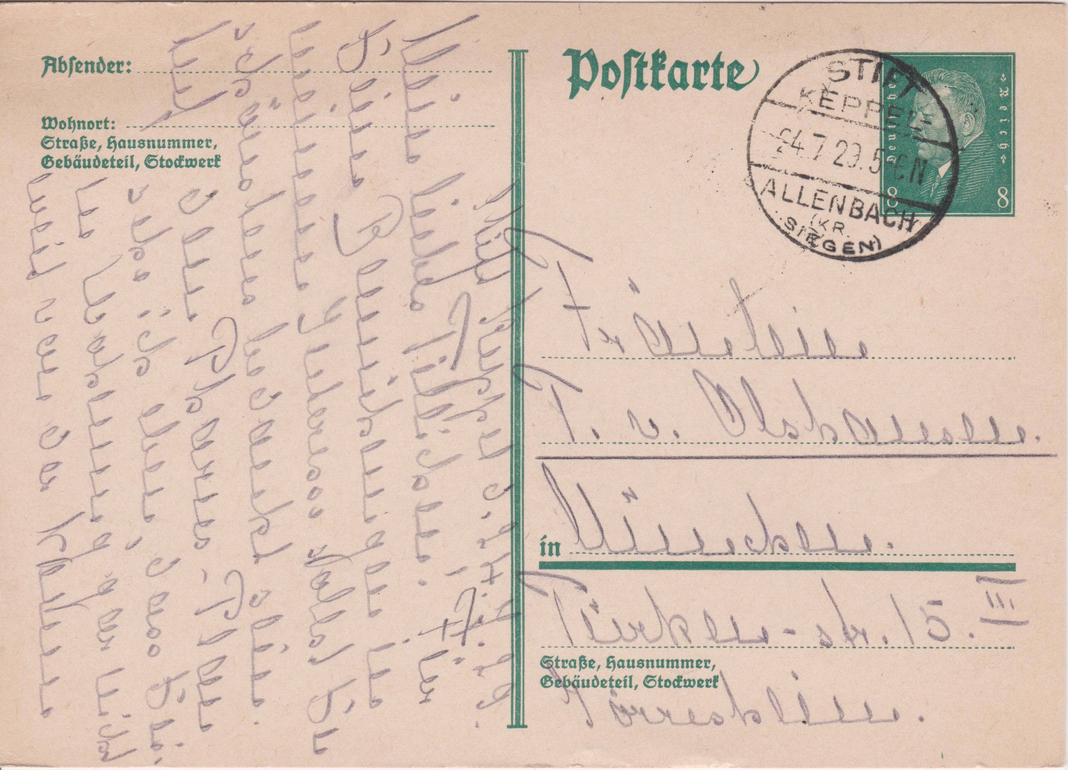 Ganzsache "Postkarte" 8 Pf Reichspräsidenten, MiNr. P 181 I, am 24.07.1929 gebraucht ab "STIFT KEPPEL-ALLENBACH (KR. SIEGEN)":