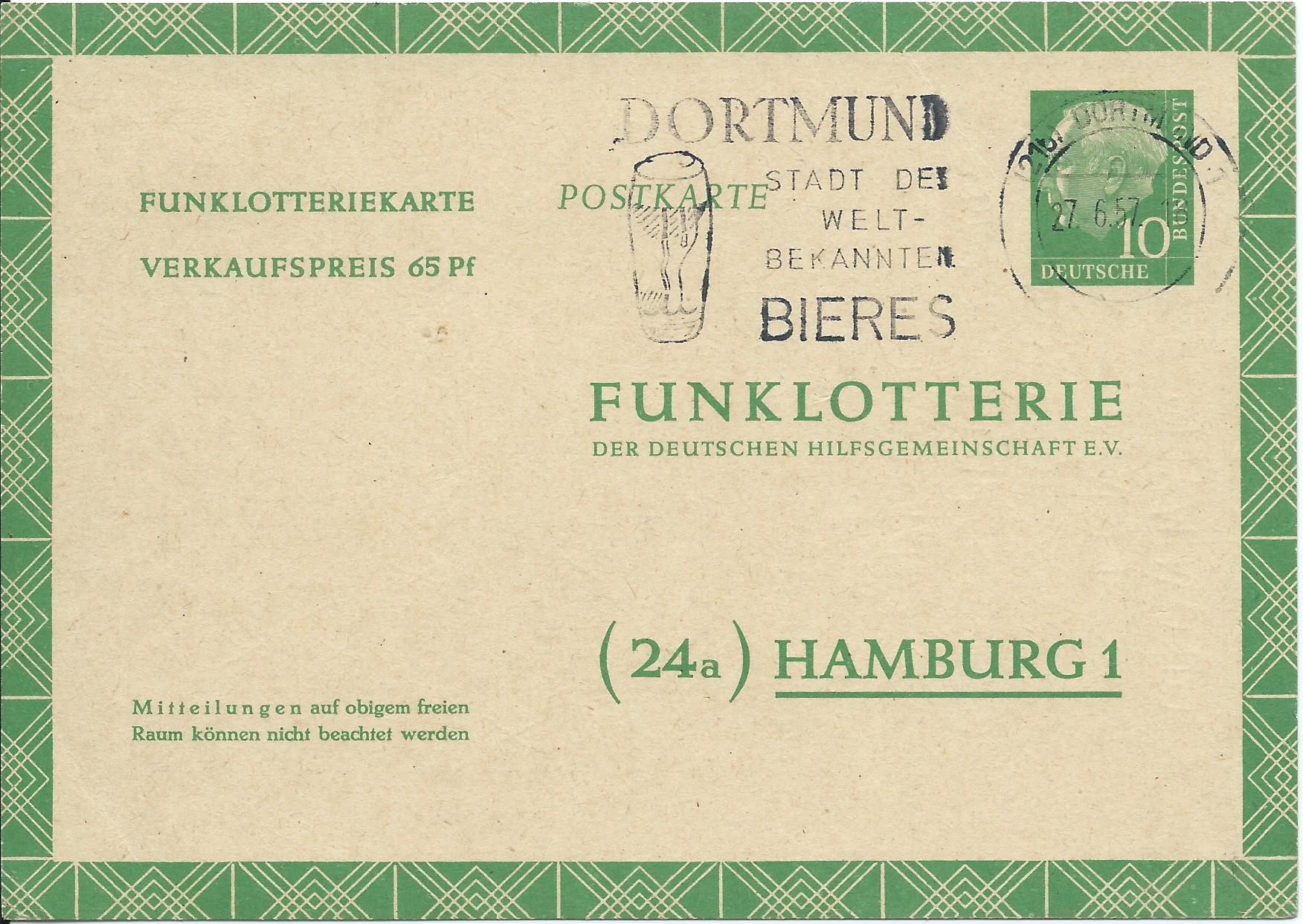 Zeigen kann ich hier 4 verschiedene Karten, beginnend mit dem Wertstempel Heuss I 10 Pf. Diese Karte wurde am 27.6.57 in Dortmund auf die Reise geschickt.