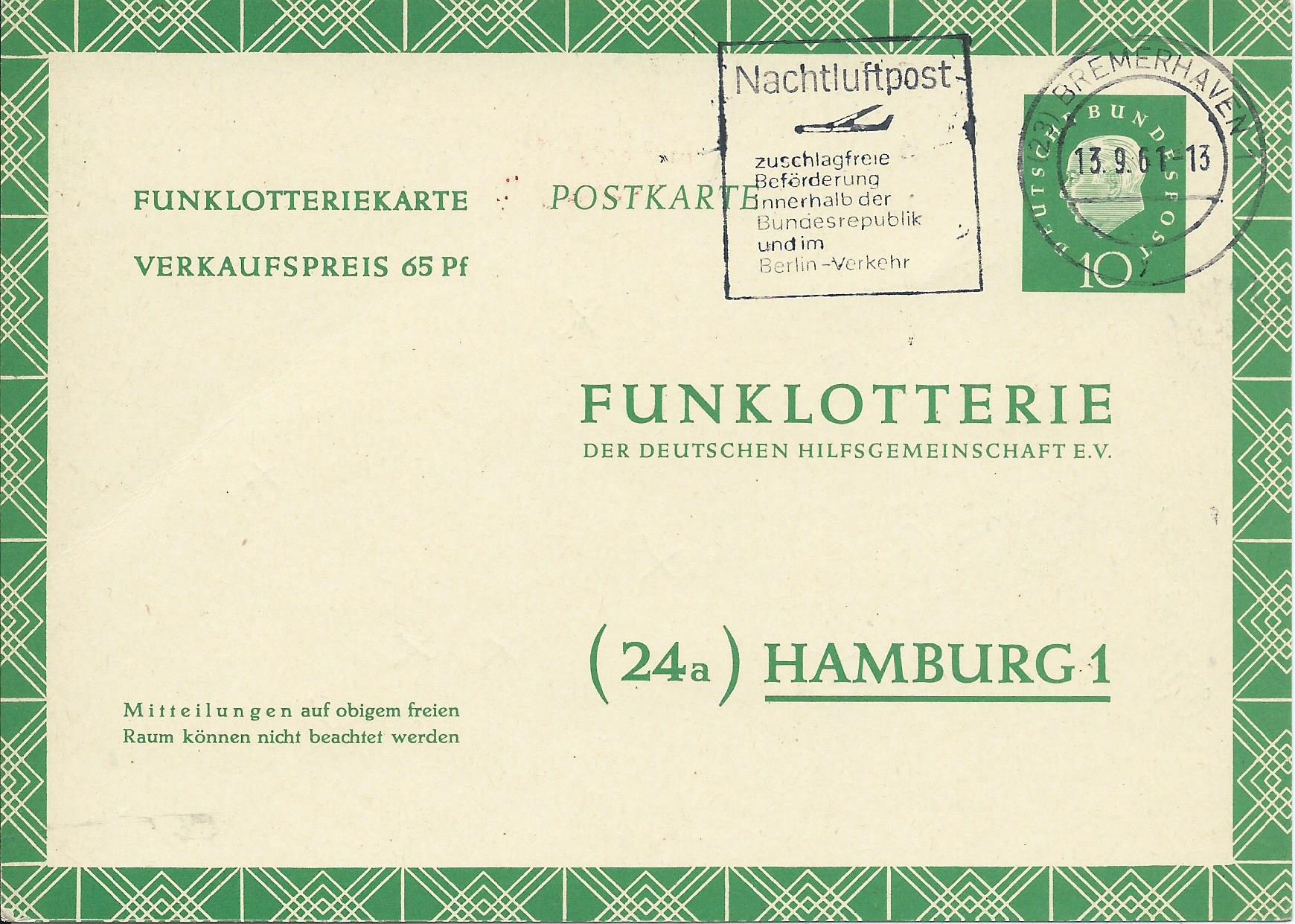 Die Lotterie wurde von der Deutschen Hilfsgemeinschaft über den Norddeutschen Rundfunk veranstaltet, und diese Postkarten dienten zur Teilnahme an der Lotterie der Ratesendung Funklotterie. Für die ersten Sendungen ab 15. August 1948 gab es noch weder spezielle Postkarten noch sonstige Formulare hierfür, als Bezahlung legten die Teilnehmer daher einen 50-Pfennig-Geldschein im Brief bei.