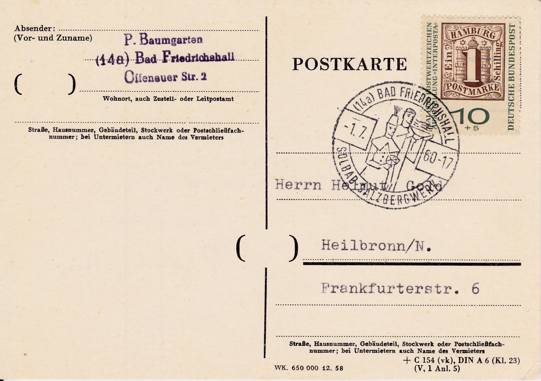 Postkarte vom 1.7.1960 von Bad Friedrichshall nach Heilbronn mit Handwerbestempel Bad Friedrichshall.