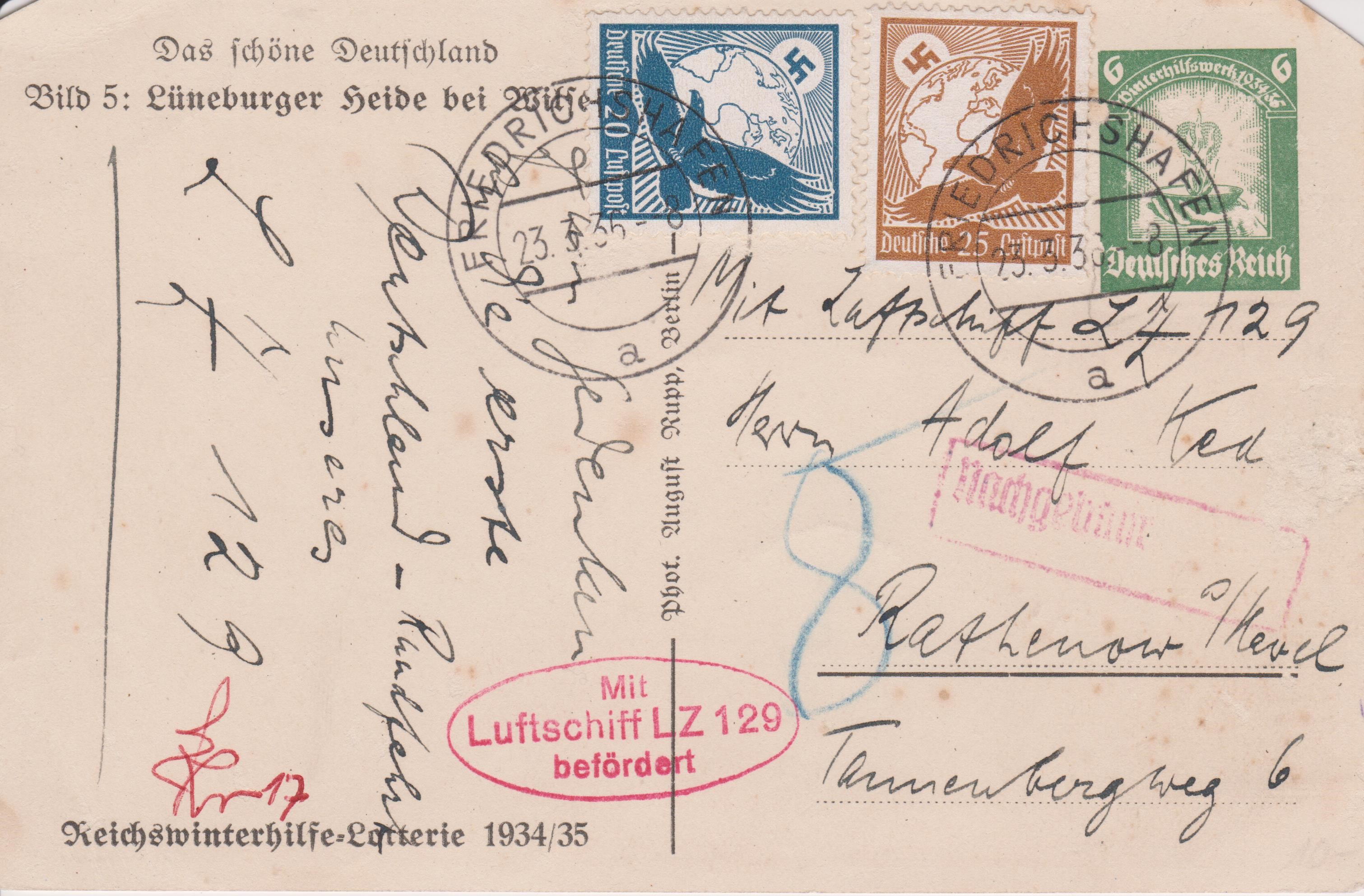 Diese Ganzsache Deutsches Reich P 254 Bild 5 zeigt die "Lüneburger Heide bei Wilsede", mit 45 Pf Zusatzfrankatur versehen, entwertet am 23.03.1936 in FRIEDRICHSHAFEN, "Mit Luftschiff LZ 129 befördert":