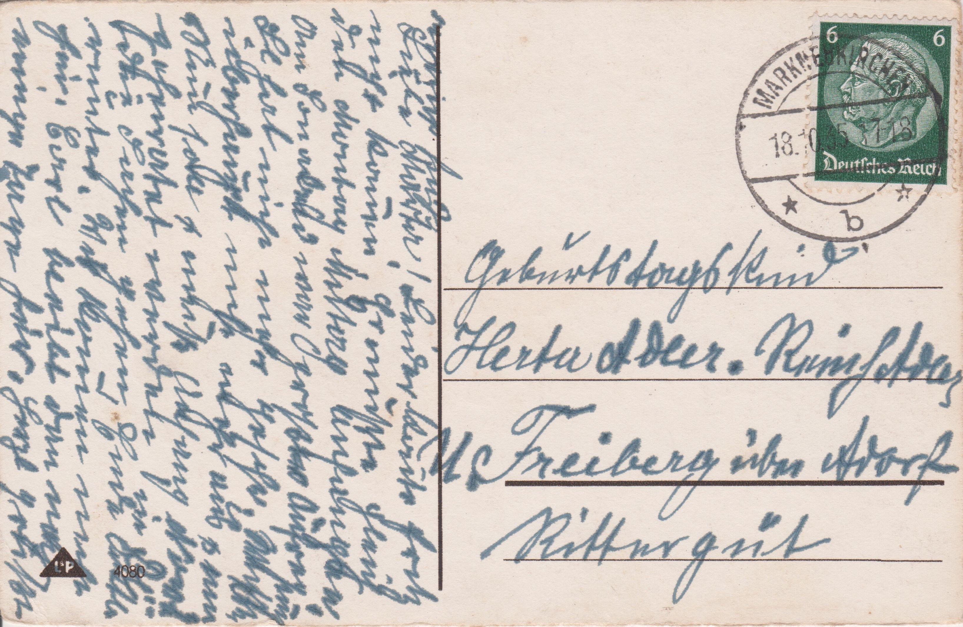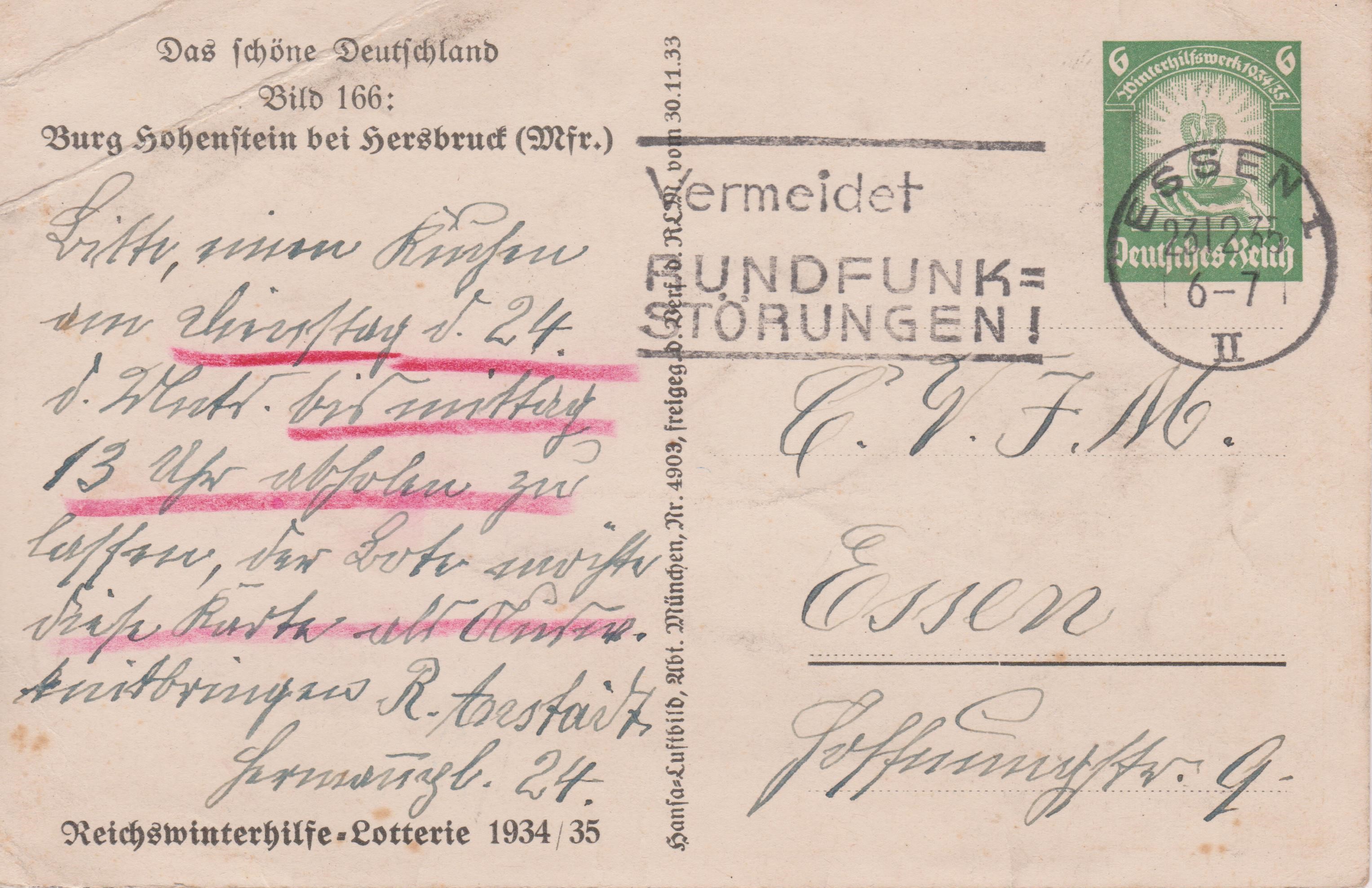 Interessant ist der der damaligen Ideologie entsprechende Maschinenstempelzusatz "STADT DER AUSLANDSDEUTSCHEN" mit Werbeeinsatz "JEDER Volksgenosse Rundfunkhörer".
