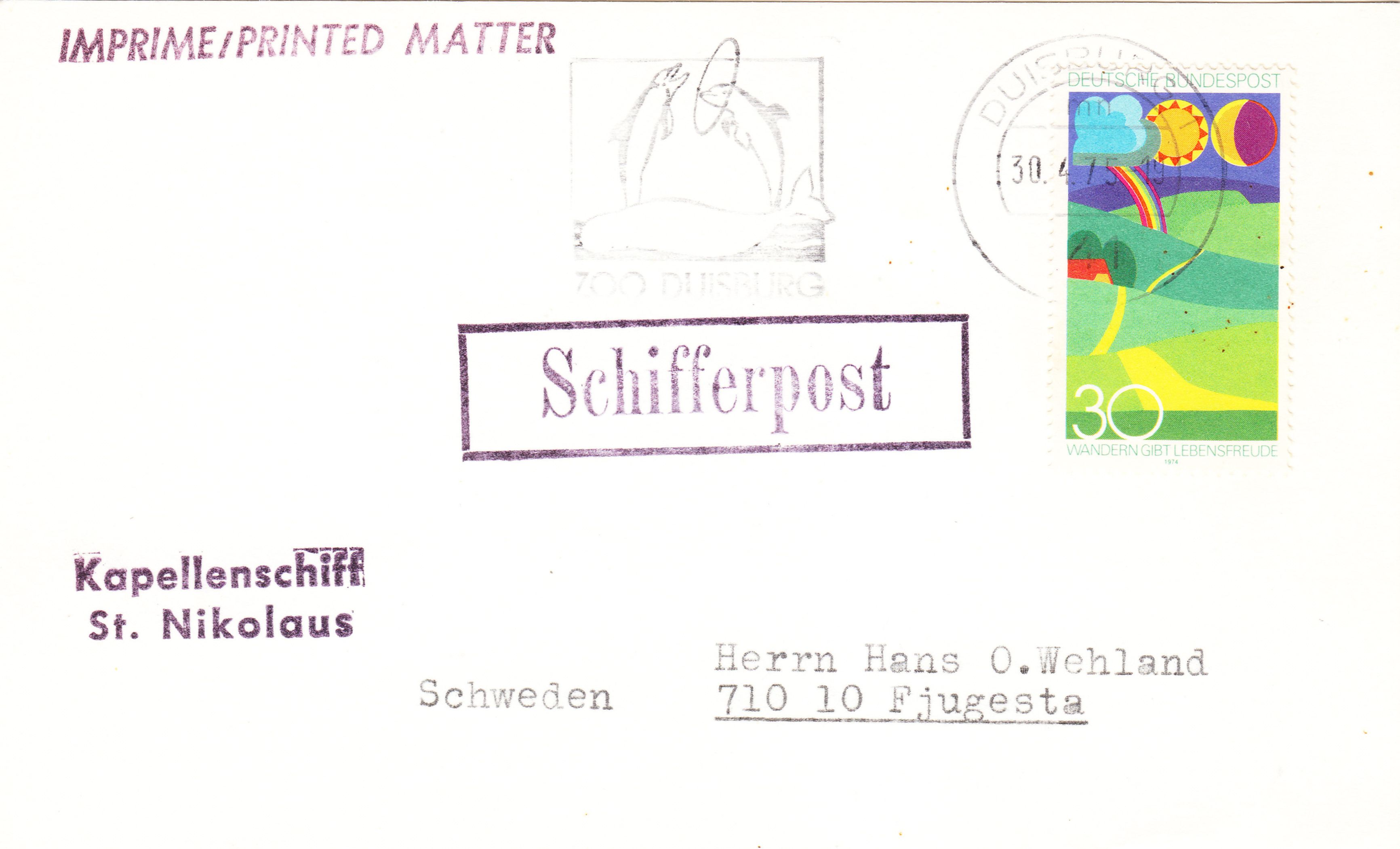 Hier als Beispiel eine Drucksache nach Schweden vom 30.04.1975, aufgegeben auf dem "Kapellenschiff St. Nikolaus", einer schwimmenden Kapelle für die Binnenschiffer in Ruhrort: