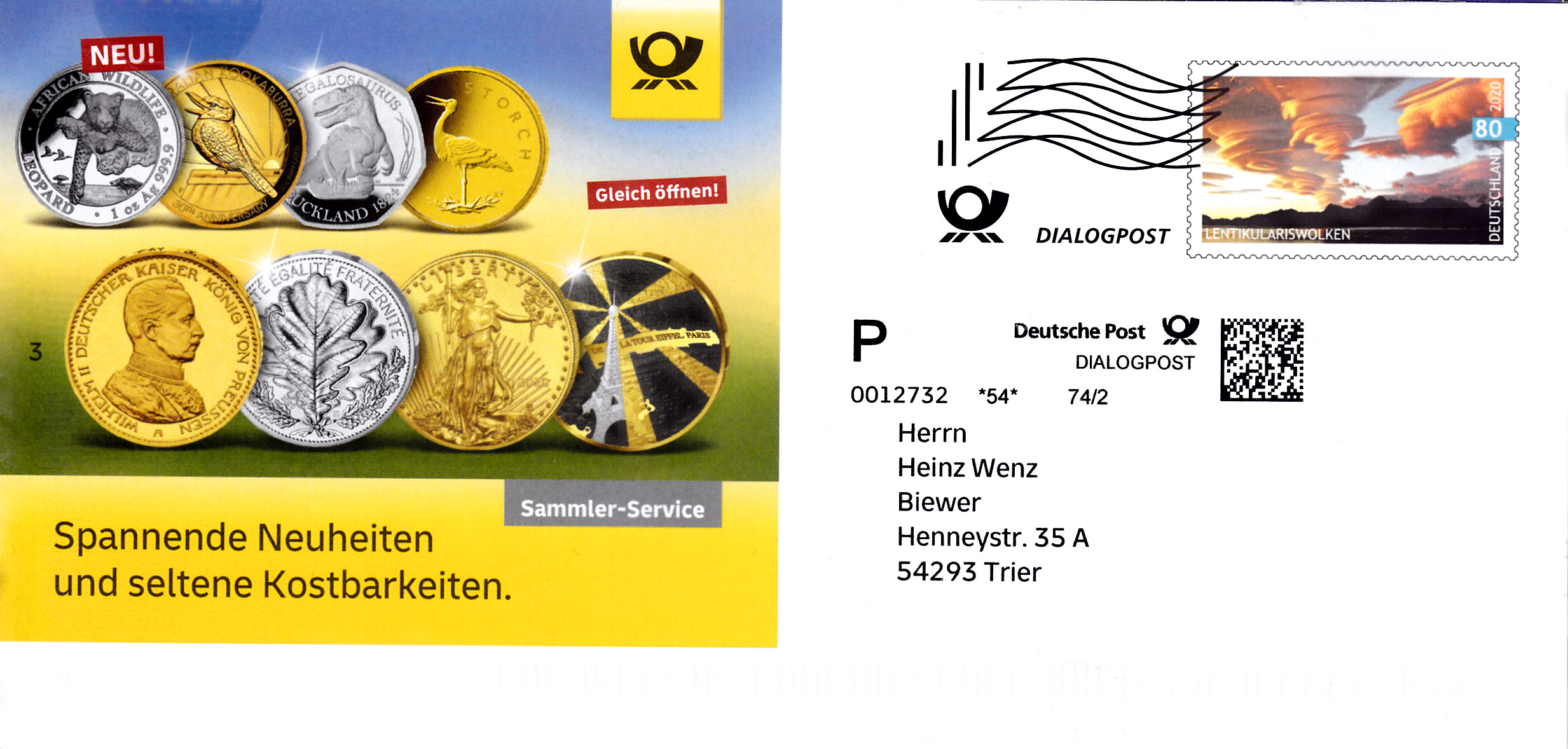 Faltbrief 210 mm x 102 mm mit Wertstempel der 80 Cent-Marke "Lentikulariswolken" (MiNr 3528) mit aufgedruckter Zähnung. Der Wertstempel ist mit einer Welle "Dialogpost" entwertet.
