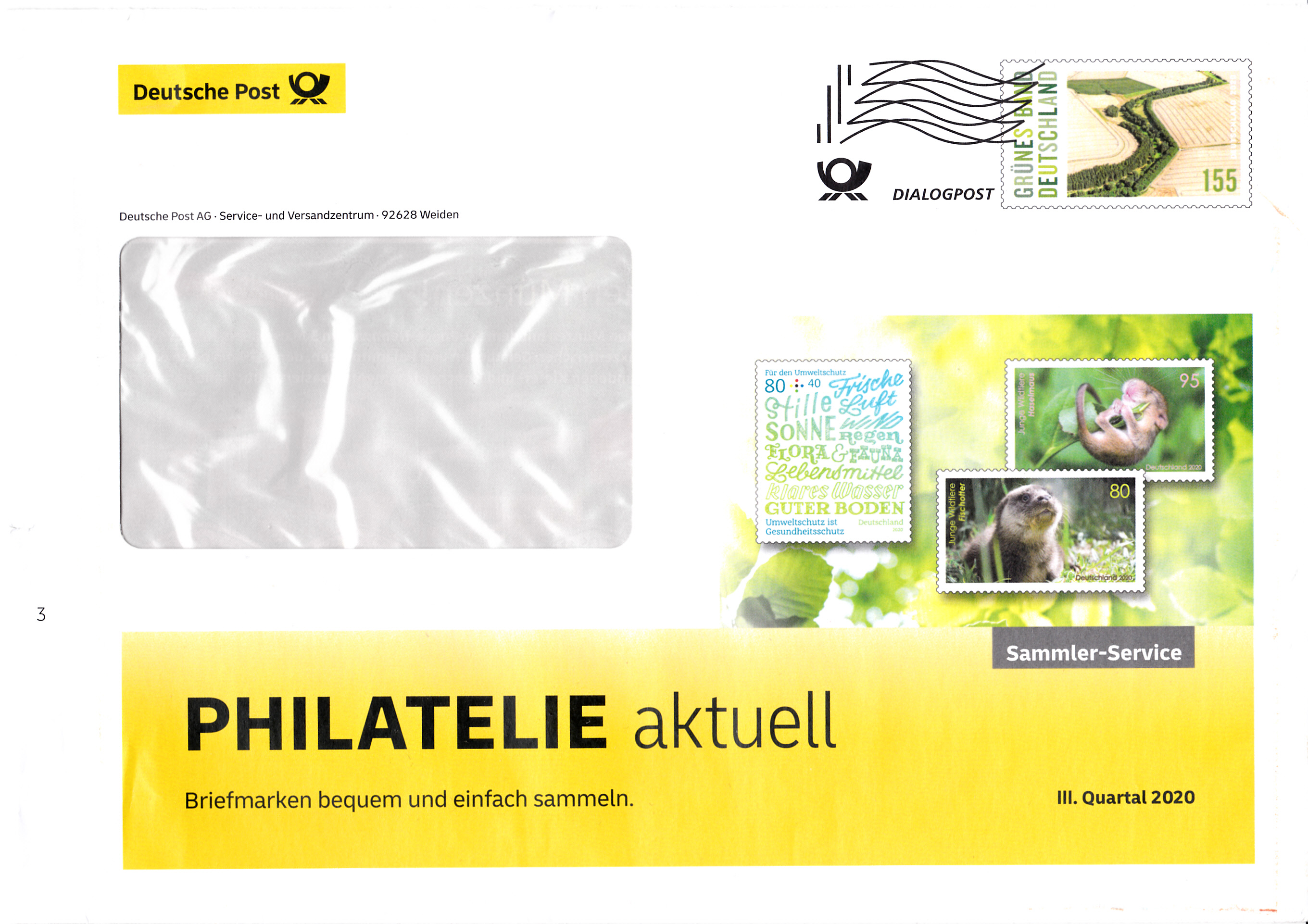 Umschlag im Format 229x162 mm mit einem Wertstempel mit der 155 Cent Marke (MiNr 3529) mit dem Motiv Naturschutzprojekt „Grünes Band Deutschland" mit aufgedruckter Zähnung. Der Wertstempel ist mit einer Welle "Dialogpost" entwertet.