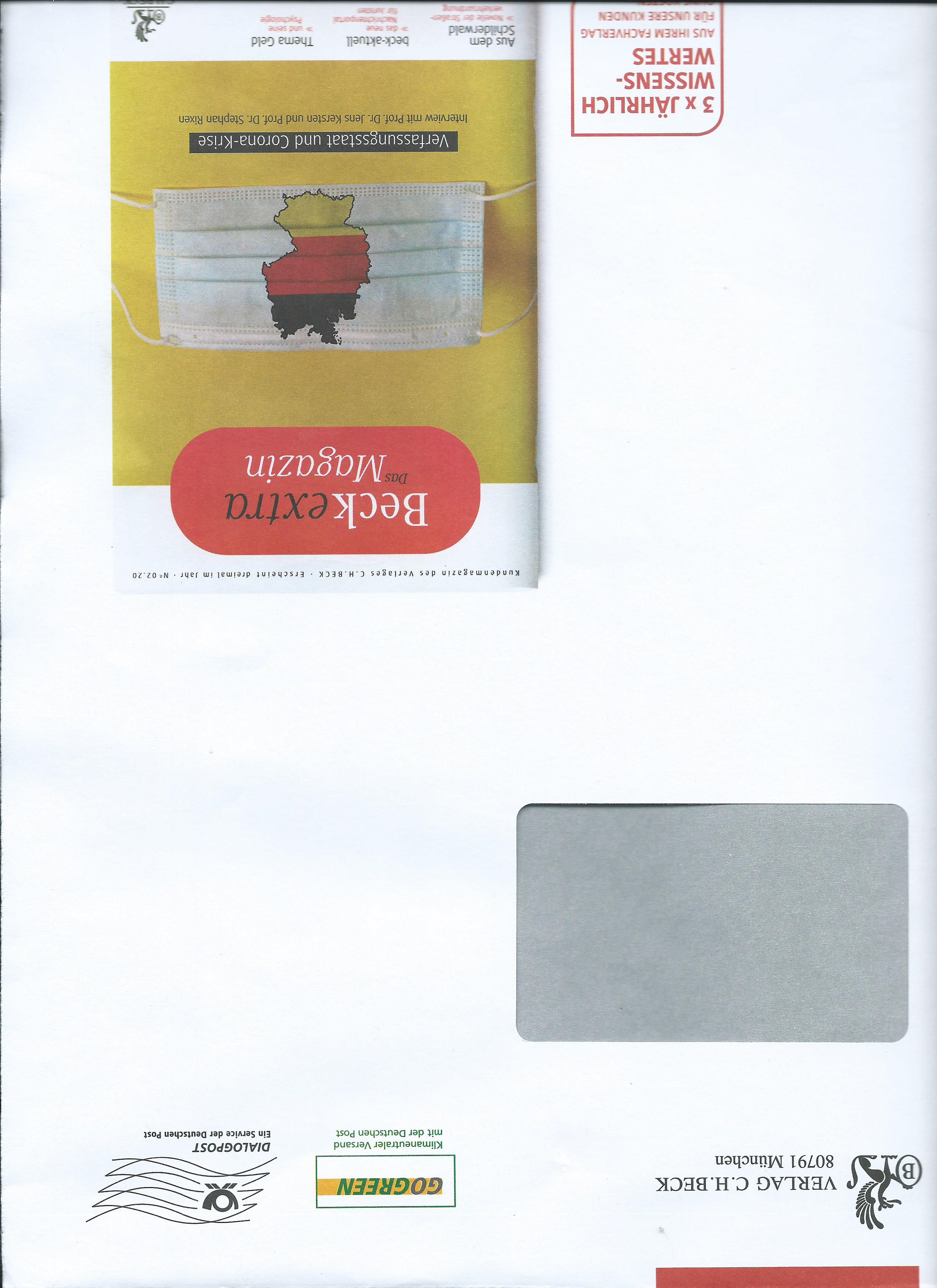 ein großer Umschlag als Neuzugang der Dialogpost. Er stammt vom Verlag C. H. Beck und trägt nur die Frankierwelle ohne markenähnlichen Zudruck. Aber er ist vorbildlich, dieser Umschlag trägt eine „Corona-Maske“