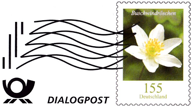 Diese Broschüre im Format 235 x 152 mm (unten geheftet) hat einen Wertstempel mit einer 155 Cent Marke "Buschwindröschen" aus der Dauerserie "Blumen" (MiNr 3472). Die Marke ist mit einer Welle "Dialogpost" entwertet.