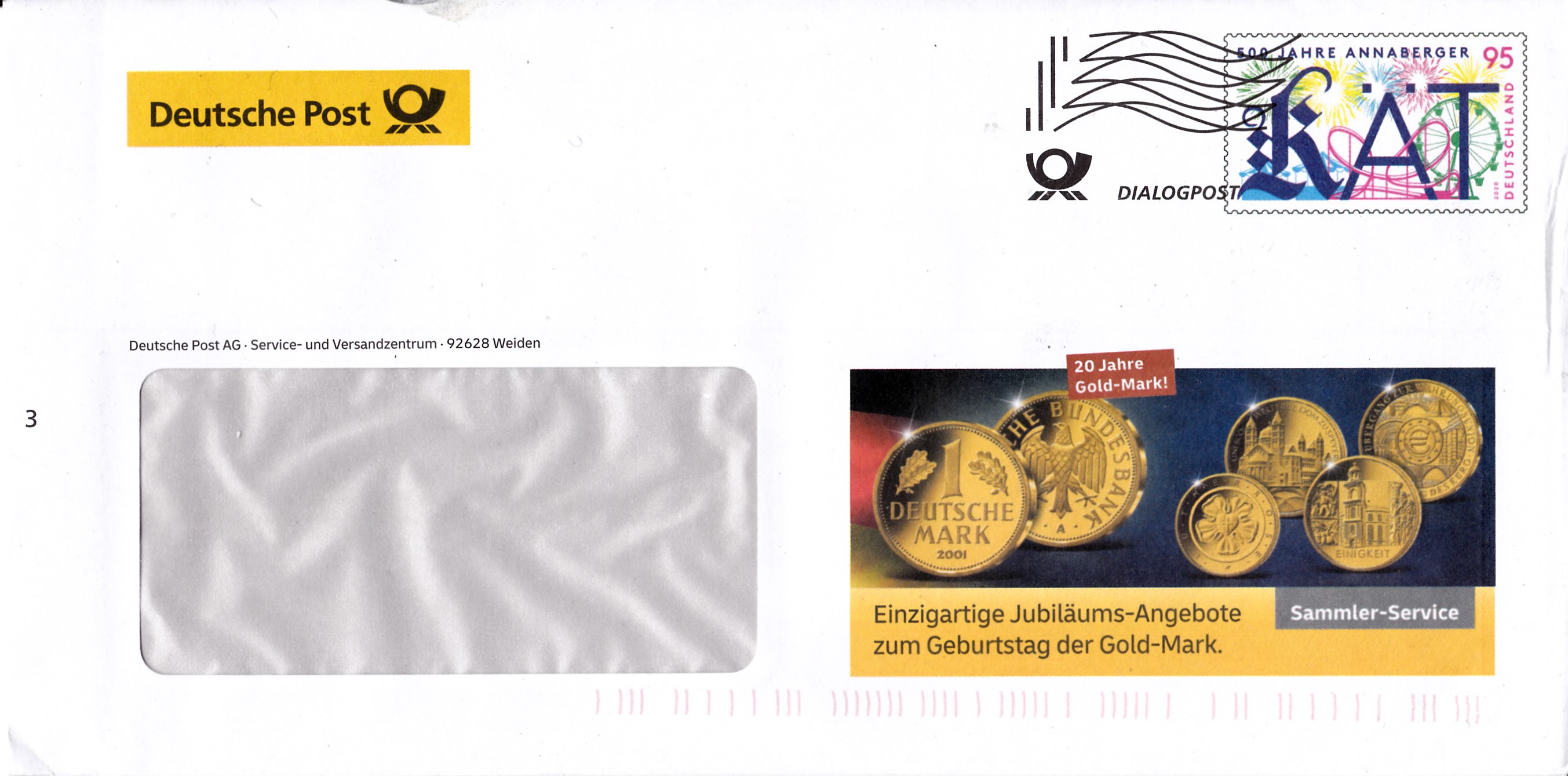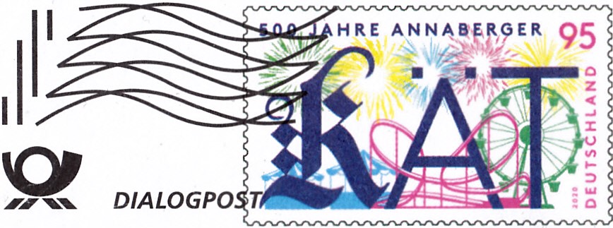Umschlag im Format 229x115 mm mit einem Wertstempel mit der 95 Cent Marke (MiNr 3547) mit dem Motiv "500 Jahre Volksfest Annaberger Kät" mit aufgedruckter Zähnung. Der Wertstempel ist mit einer Welle "Dialogpost" entwertet.