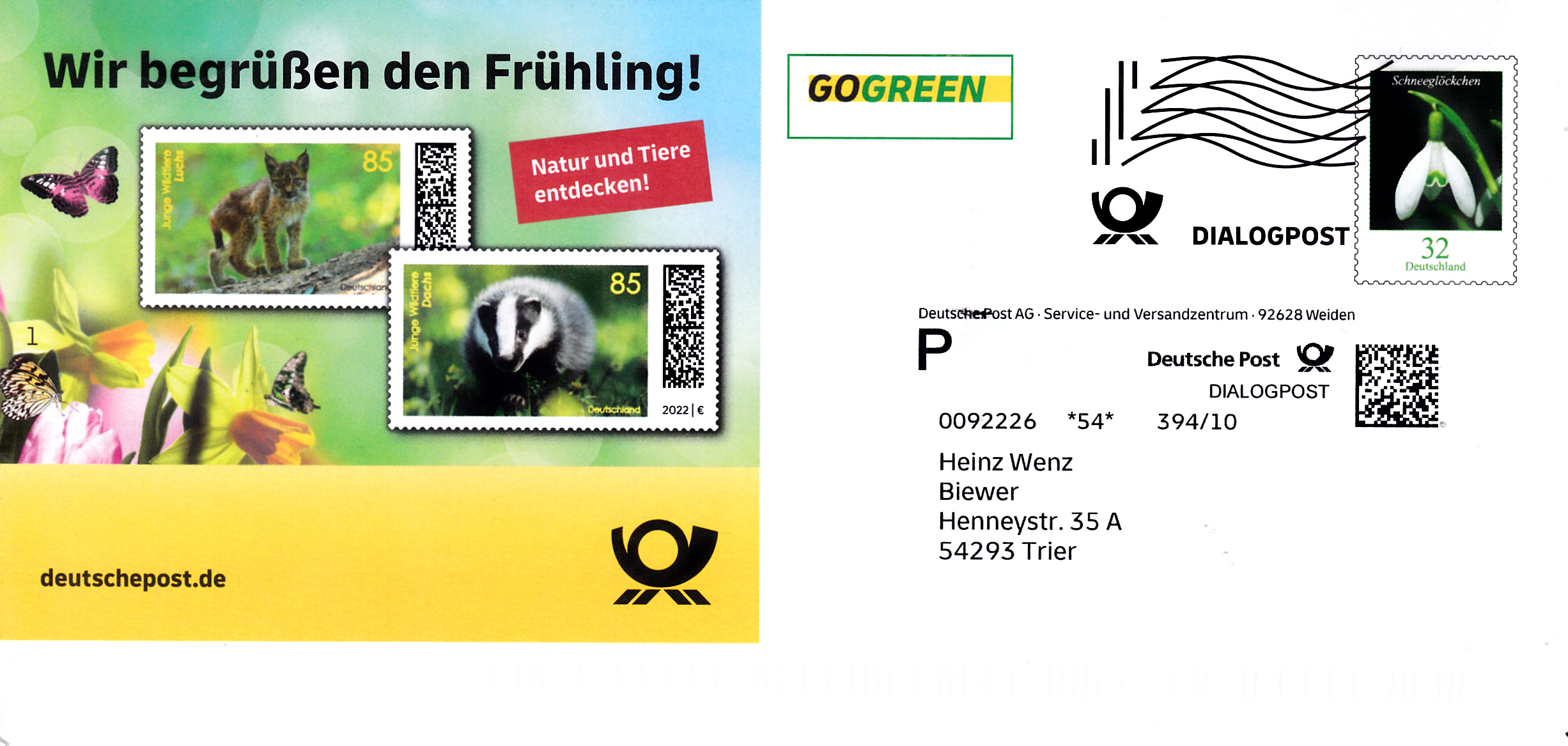 Die Deutsche Post verzichtet seit Anfang 2023 darauf ihre Dialagpost mit Wertstempel zu versehen, wie dieser Faltbrief 210 mm x 102 mm belegt. Es werden statt dessen quadratische Motive mit einer Welle "Dialogpost" aufgedruckt. Bei dieser Dialogpost wird dem Empfänger ein gutes neues Jahr gewpünscht.