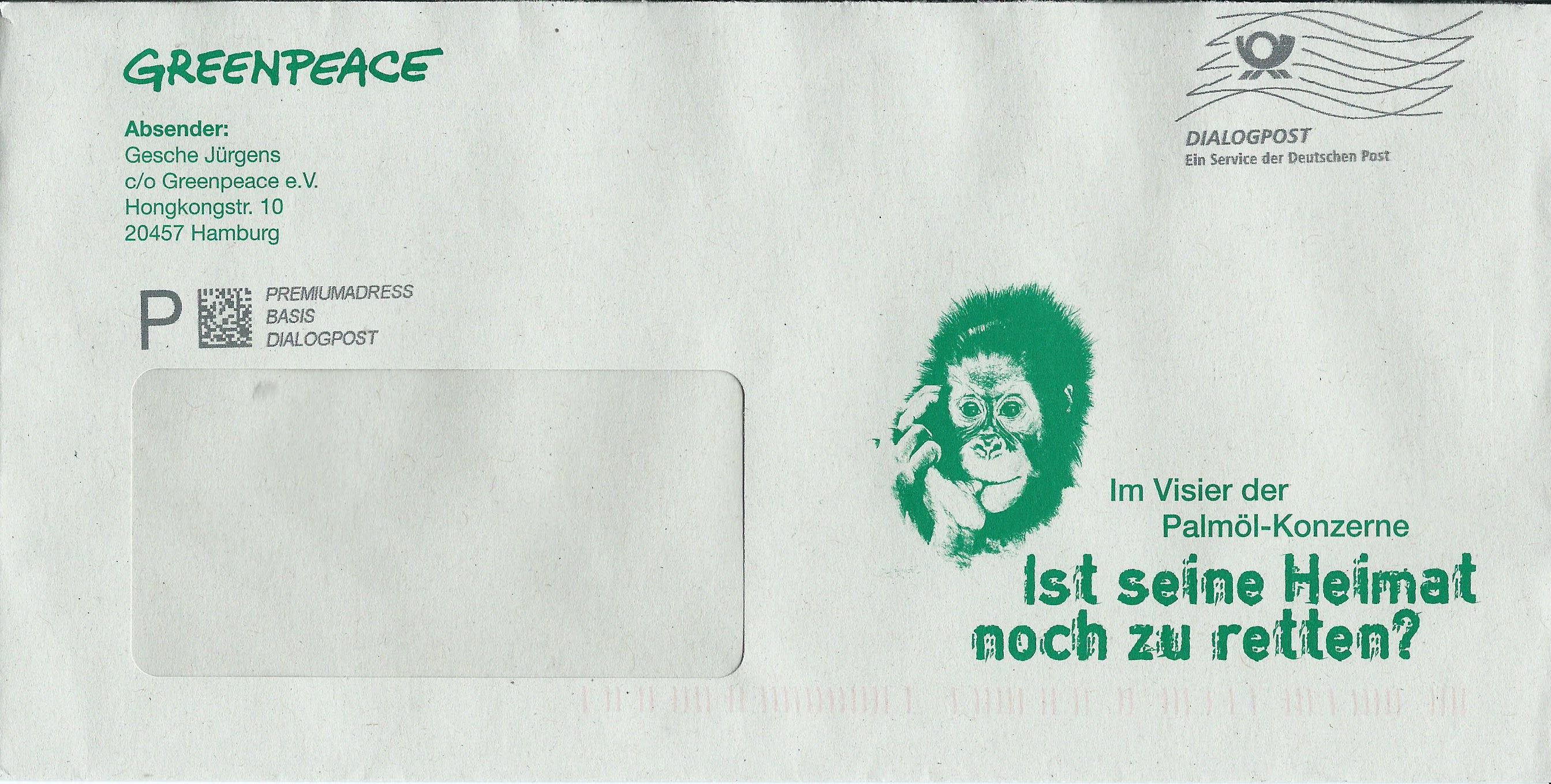 Zum einen von GREENPEACE, ohne Markenähnlichen „Wertstempel“, nur die bekannte Frankierwelle.