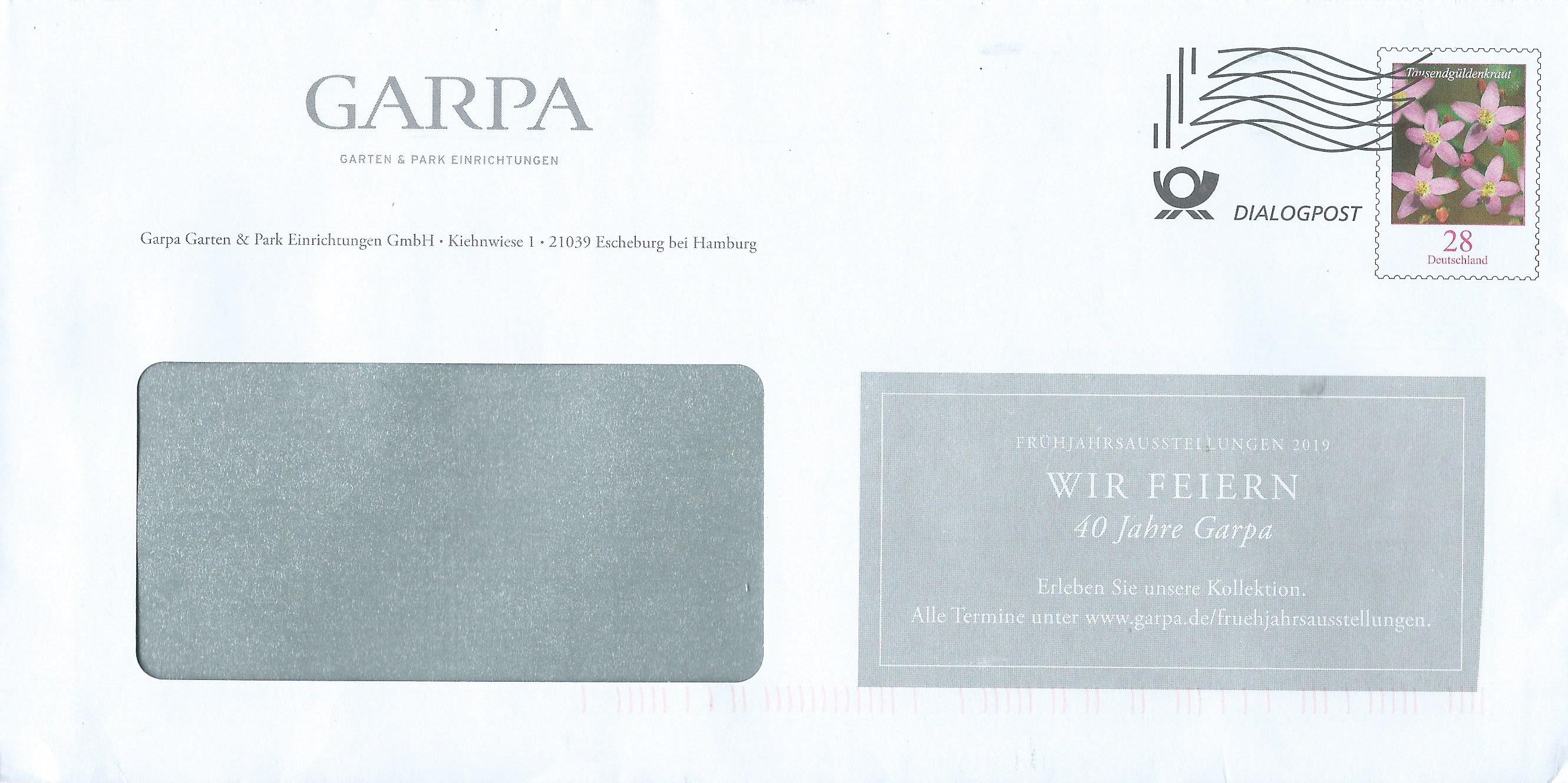 Und der dritte im Bunde ist etwas hübscher anzusehen: Er stammt von der Firma GARPA und hat die Frankierwelle auf einer eingedruckten Marke Blumen zu 28 Cent: