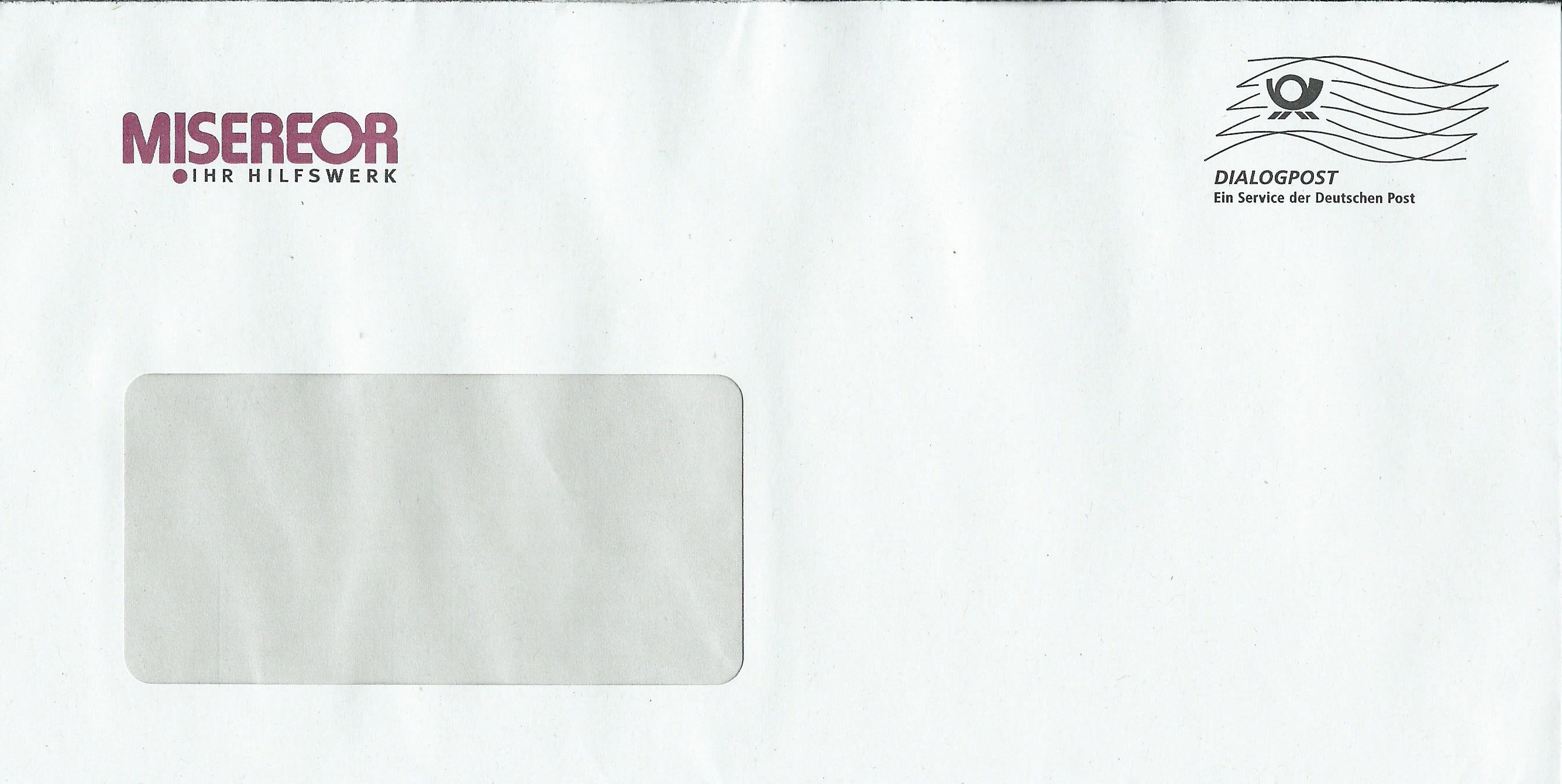 Dann haben wir einen Umschlag vom Hilfswerk MISEREOR, Frankierwelle ohne Markenähnlichen Wertstempel: