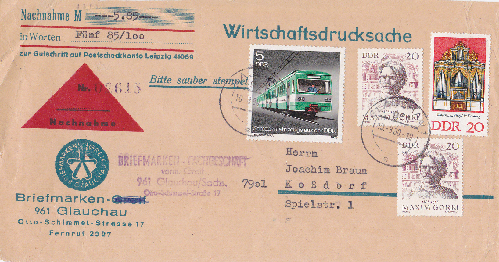 Eine Wirtschaftsdrucksache 100 - 250g kostete in der DDR von 1.1.1971bis 30.6.1990 25Pf. Ich zeige hier einen Ausschnitt aus einer Wirtschaftsdrucksache 100 - 250g mit Nachnahme von Glauchau nach Koßdorf. Das Porto berechnet sich wie folgt: Wirtschaftsdrucksache 100 - 250g 25Pf, Zusatzleistung Nachnahme 40Pf, zusammen also 65Pf.