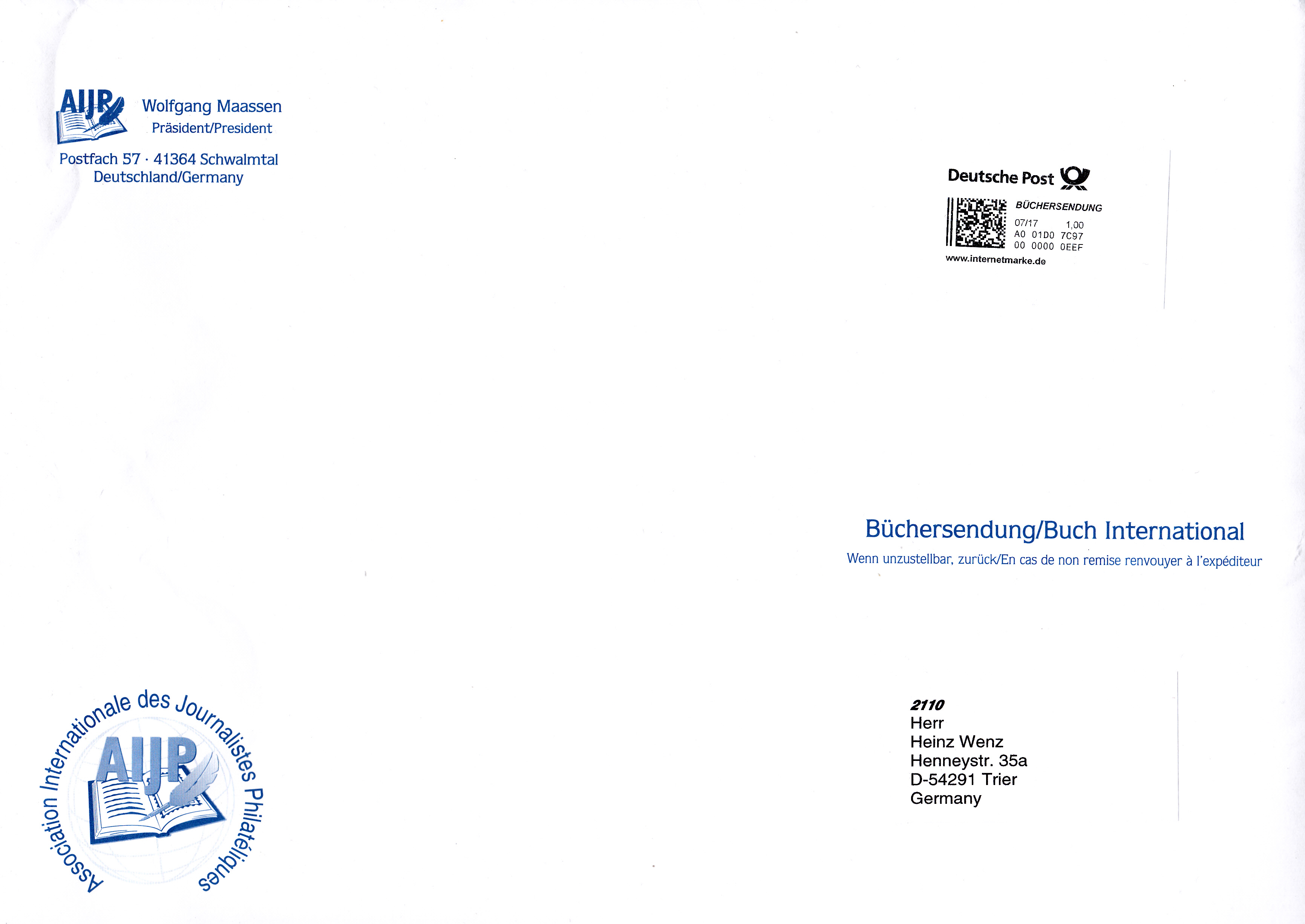 Diese Büchersendung groß wurde am 9.9.2017 bei der Sonderpostfiliale in Wittenberg aufgegeben und mit einem Sonderstempel zum 115. Philatelistentag gestempelt. Am 11.9.2017 wurde die Sendung im Briefzentrum 230 durch eine weitere "Entwertung" verunstaltet.