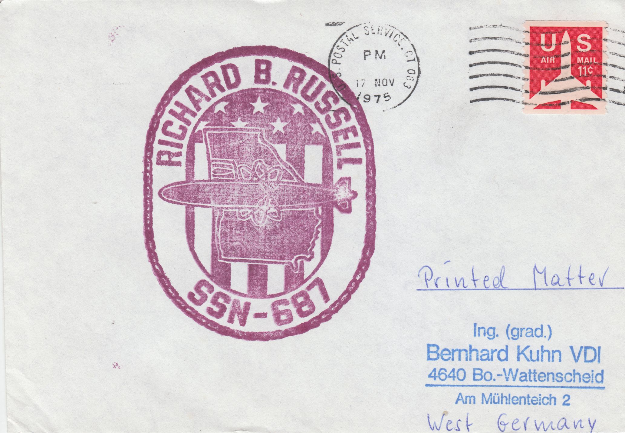Dieser Beleg vom 17.11.1975, also kurz nach der am 16.08.1975 erfolgten Indienststellung, zeigt einen Cachetstempel der USS RICHARD B. RUSSELL (SSN-687):