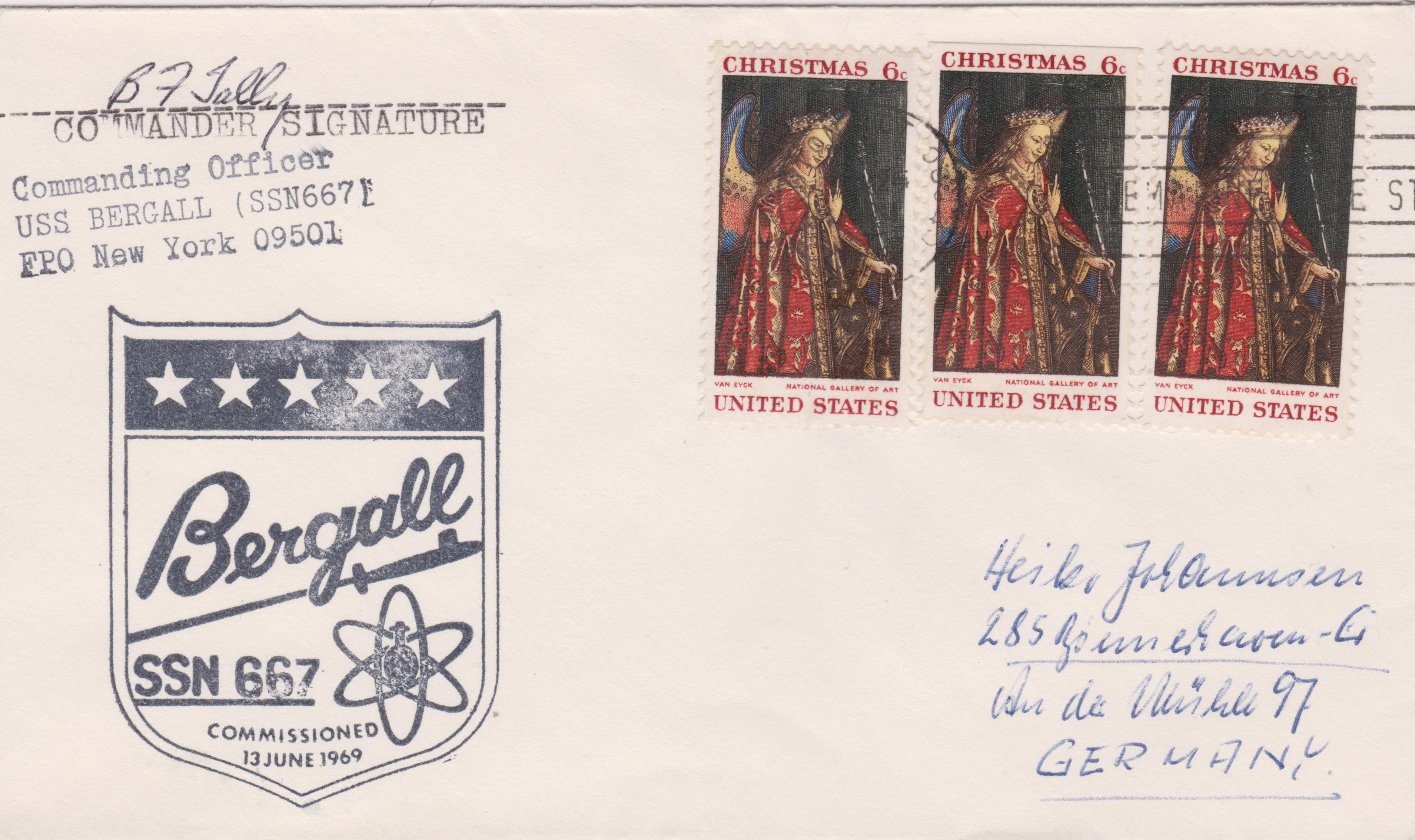 DIE USS BERGALL (SSN 667) wurde am 13.06.1969 in Dienst gestellt, was dieser Beleg per Cachetstempel dokumentiert: