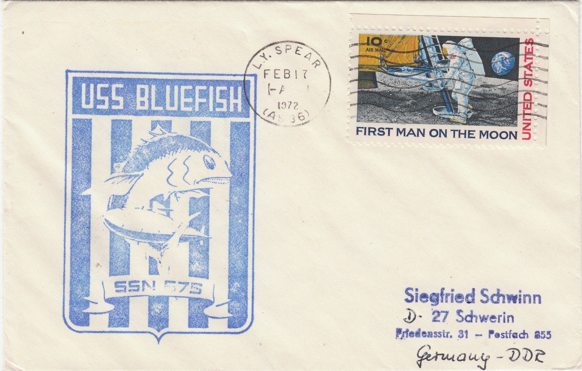 Die Frankatur wurde am 17.02.1972 per Maschinenstempel an Bord der USS L.Y. SPEAR (AS-36), dem Typschiff dieser Klasse an Tendern für Unterseeboote, entwertet.