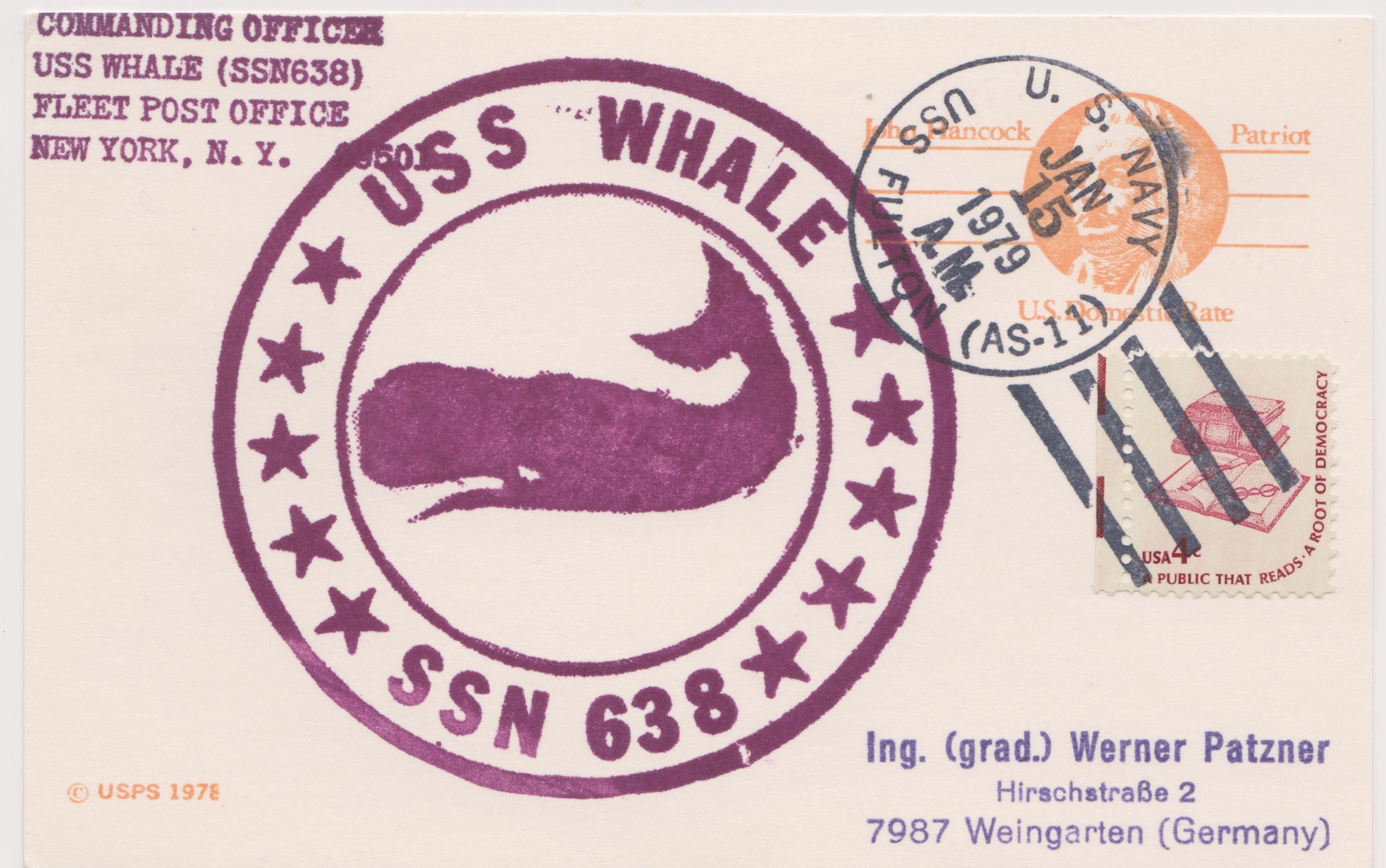 Dieser Beleg von der USS WHALE wurde am 15.01.1979 mit dem U-Boot-Tender USS FULTON (AS-11) befördert: