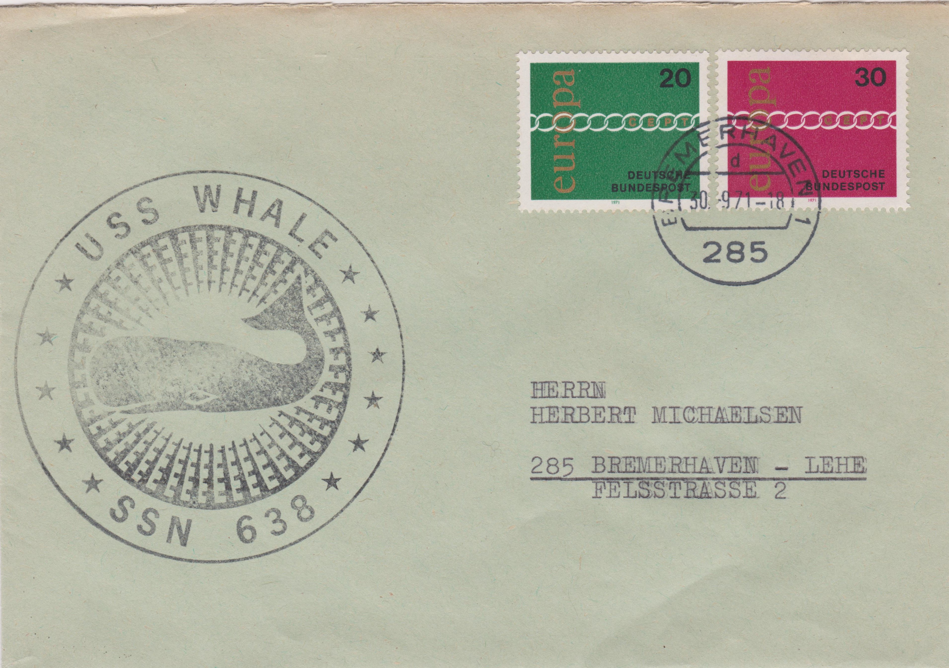 Dieser Beleg von der USS WHALE (SSN-638) wurde am 30.09.1971 in Bremerhaven aufgegeben: