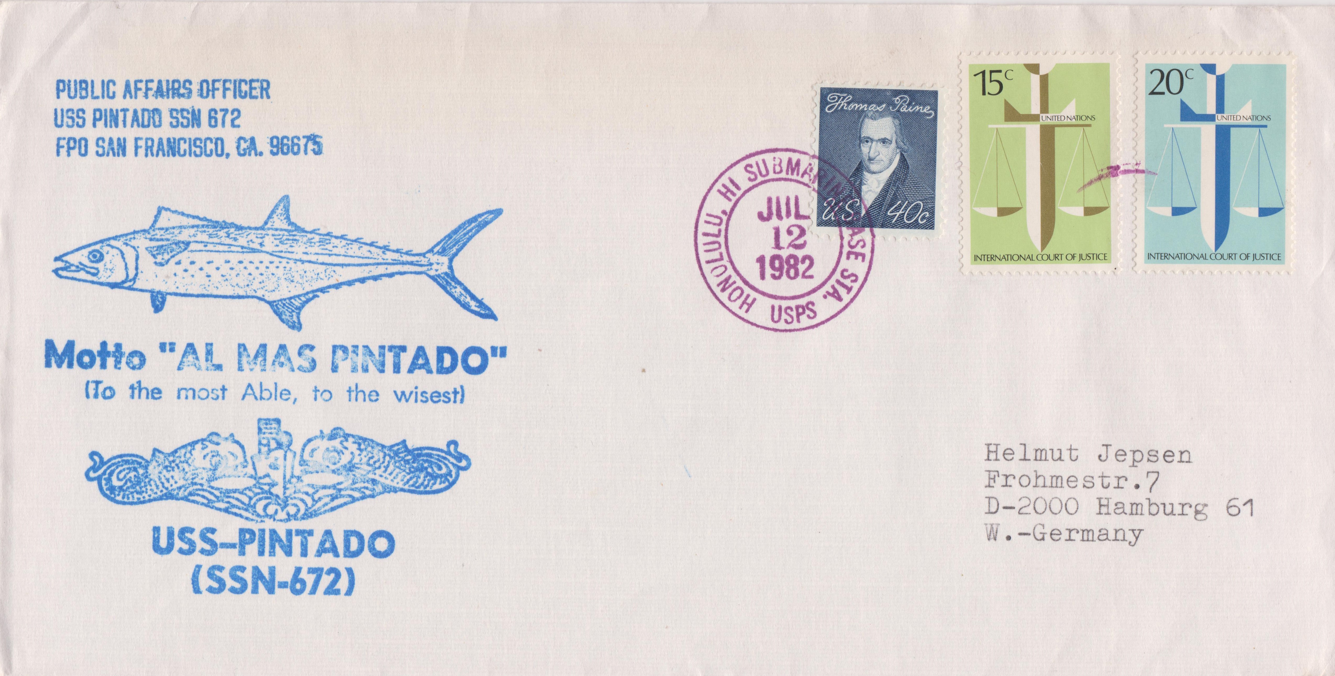 Dieser Beleg der USS PINTADO (SSN-672) wurde am 12.07.1982 in HONOLULU, HI (= Hawaii) aufgegeben: