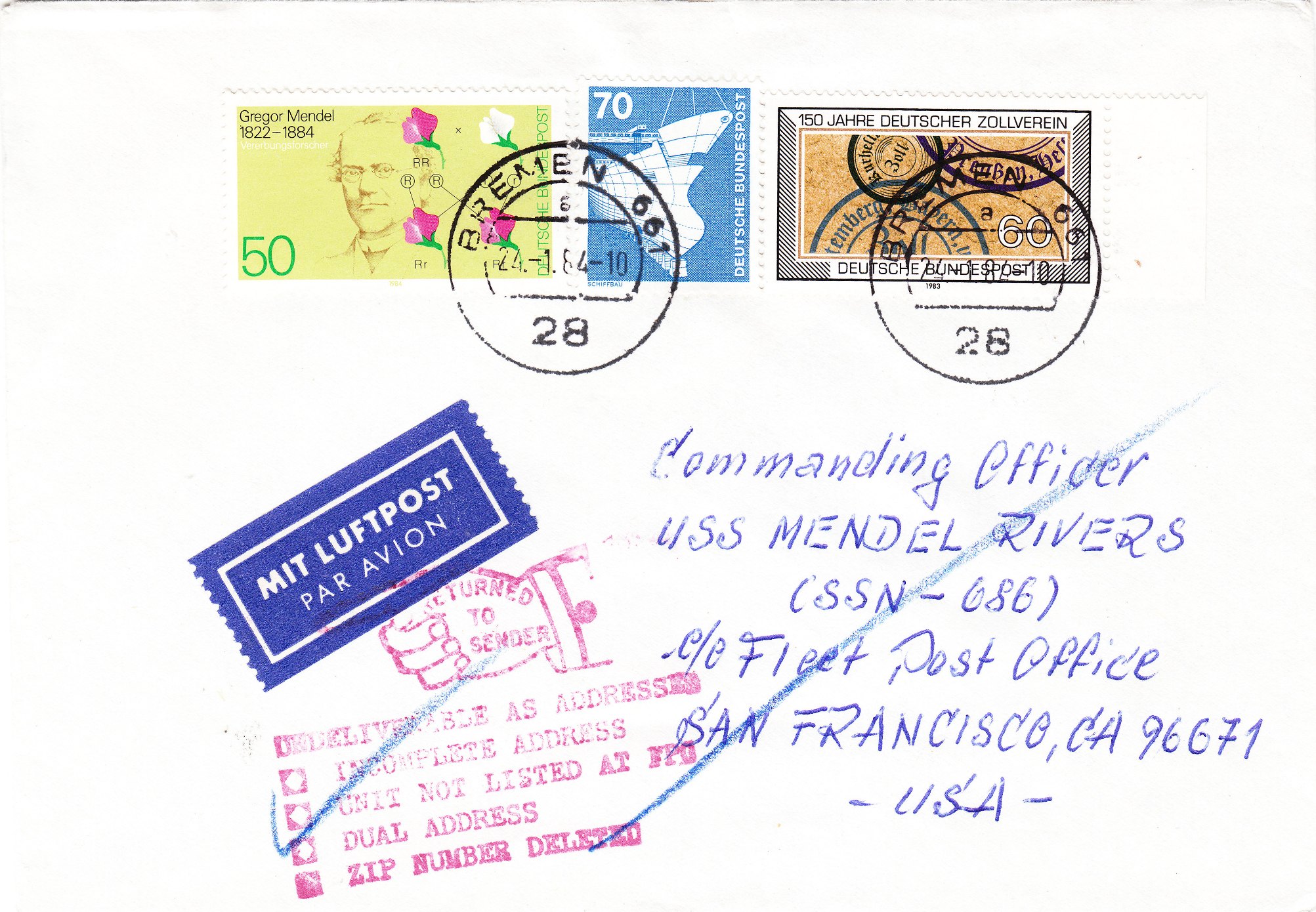 Dieser am 24.11.1984 in Bremen aufgegebene Brief erwies sich als nicht zustellbar, weil das Schiff zu dieser Zeit nicht im aktiven Dienst stand und wurde daher an den Absender zurück geleitet:
