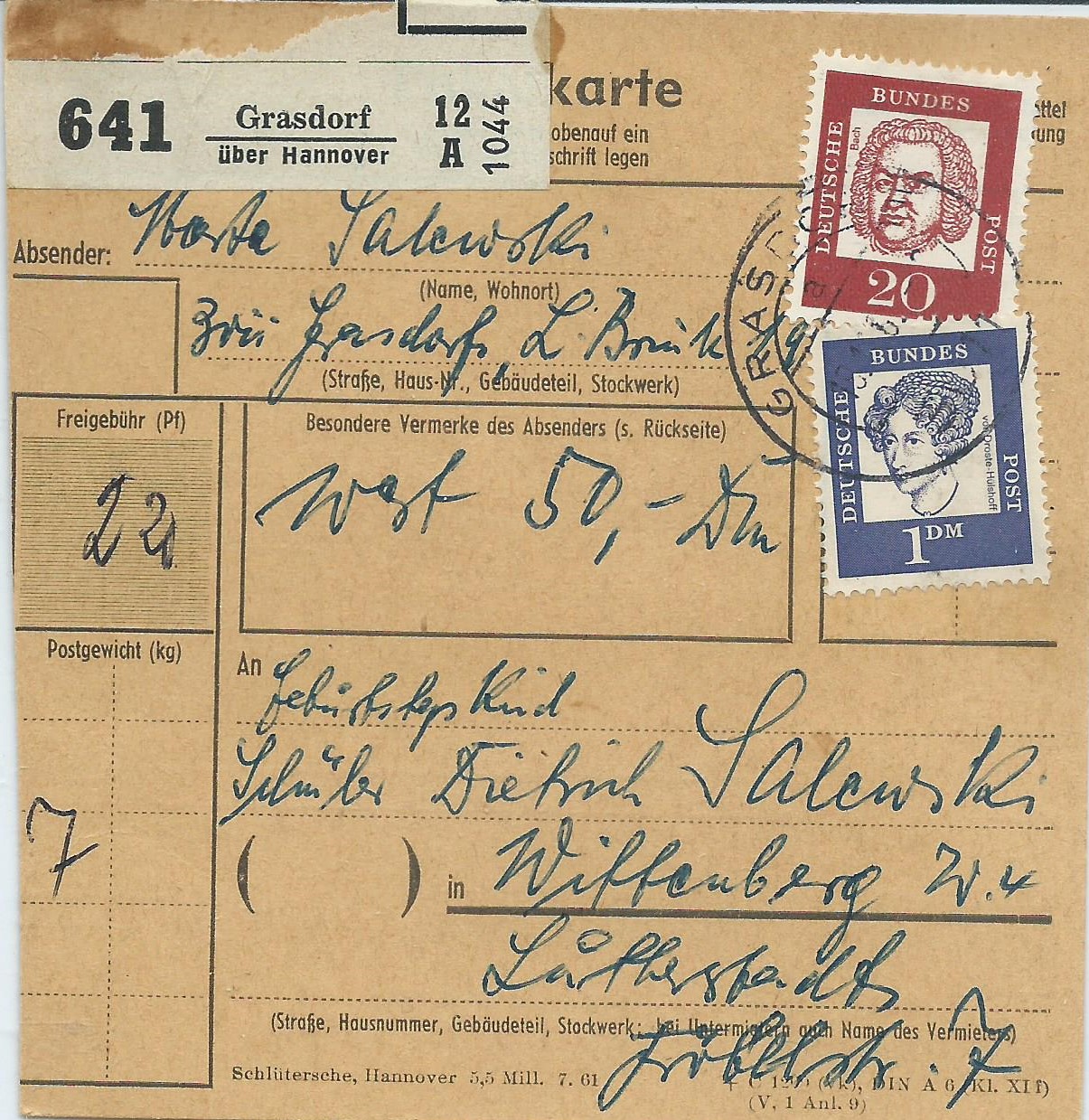 Dann eine reine Bedeutende Deutsche-Frankatur: 2 Marken zu 1 DM und eine zu 20 Pf, abgestempelt am 19.11.62 in Grasdorf. Die Paketkarte lief nach Lutherstadt Wittenberg. Hier hat der Absender das „X“ vergessen, aber sie scheint trotzdem angekommen zu sein.