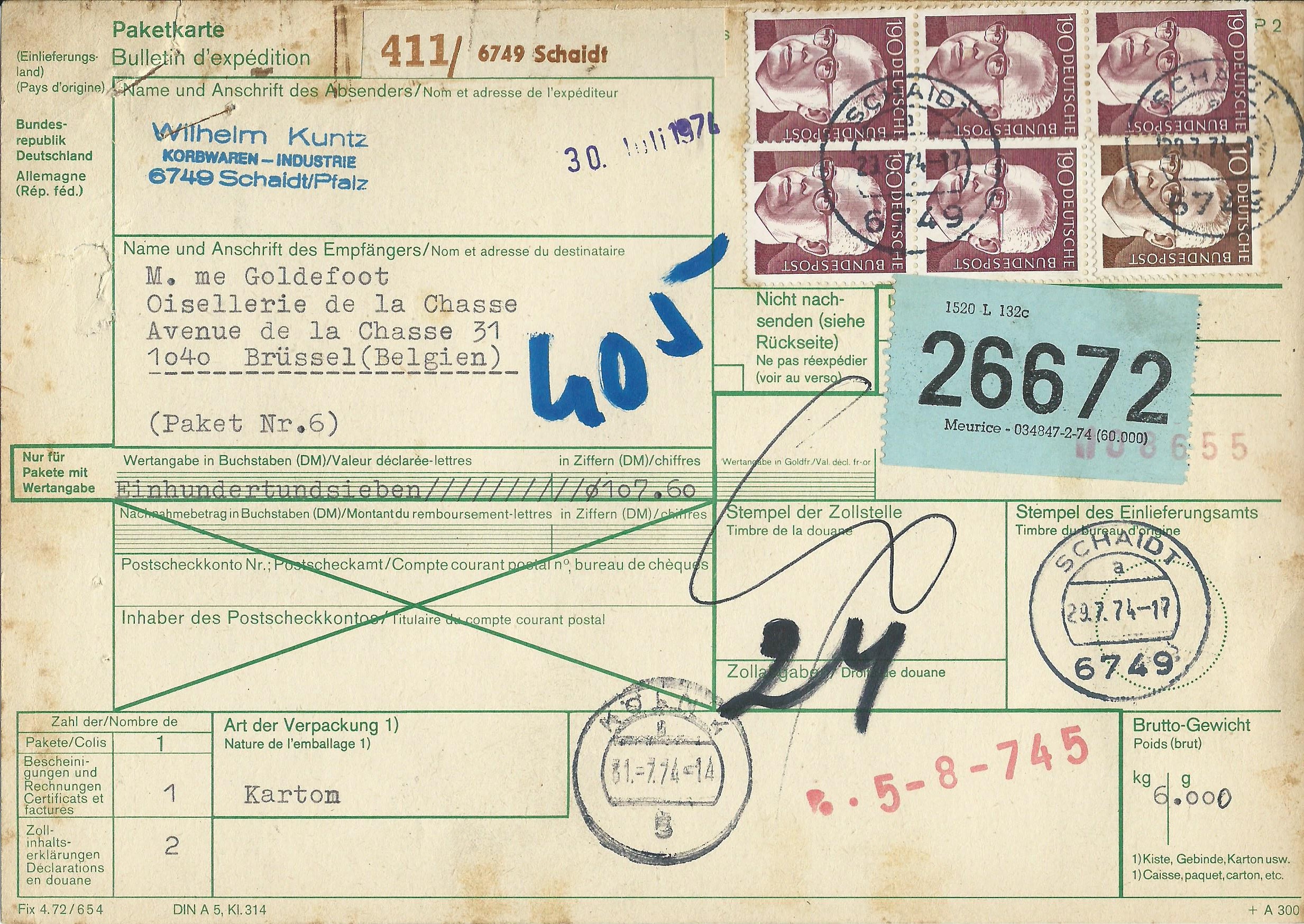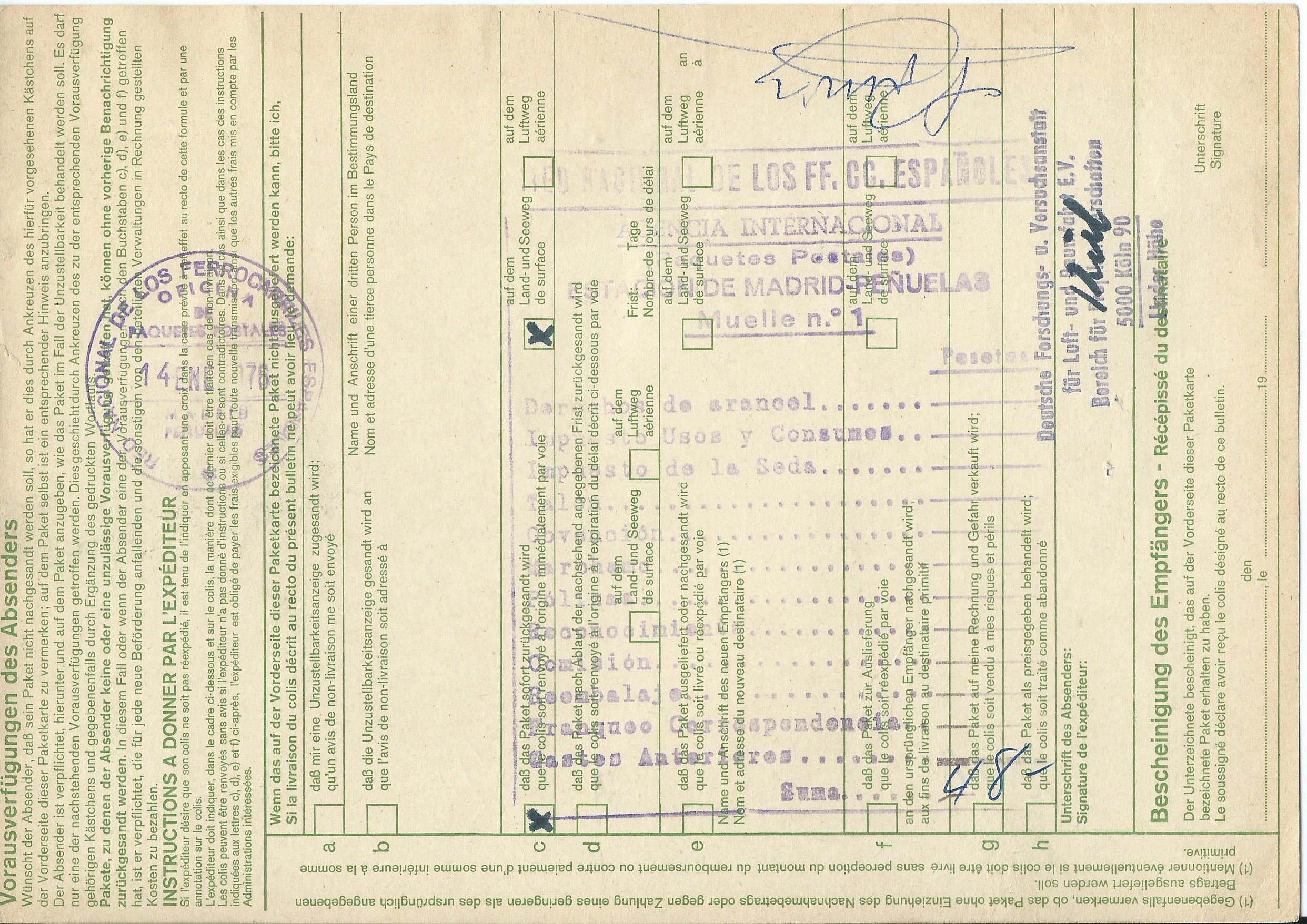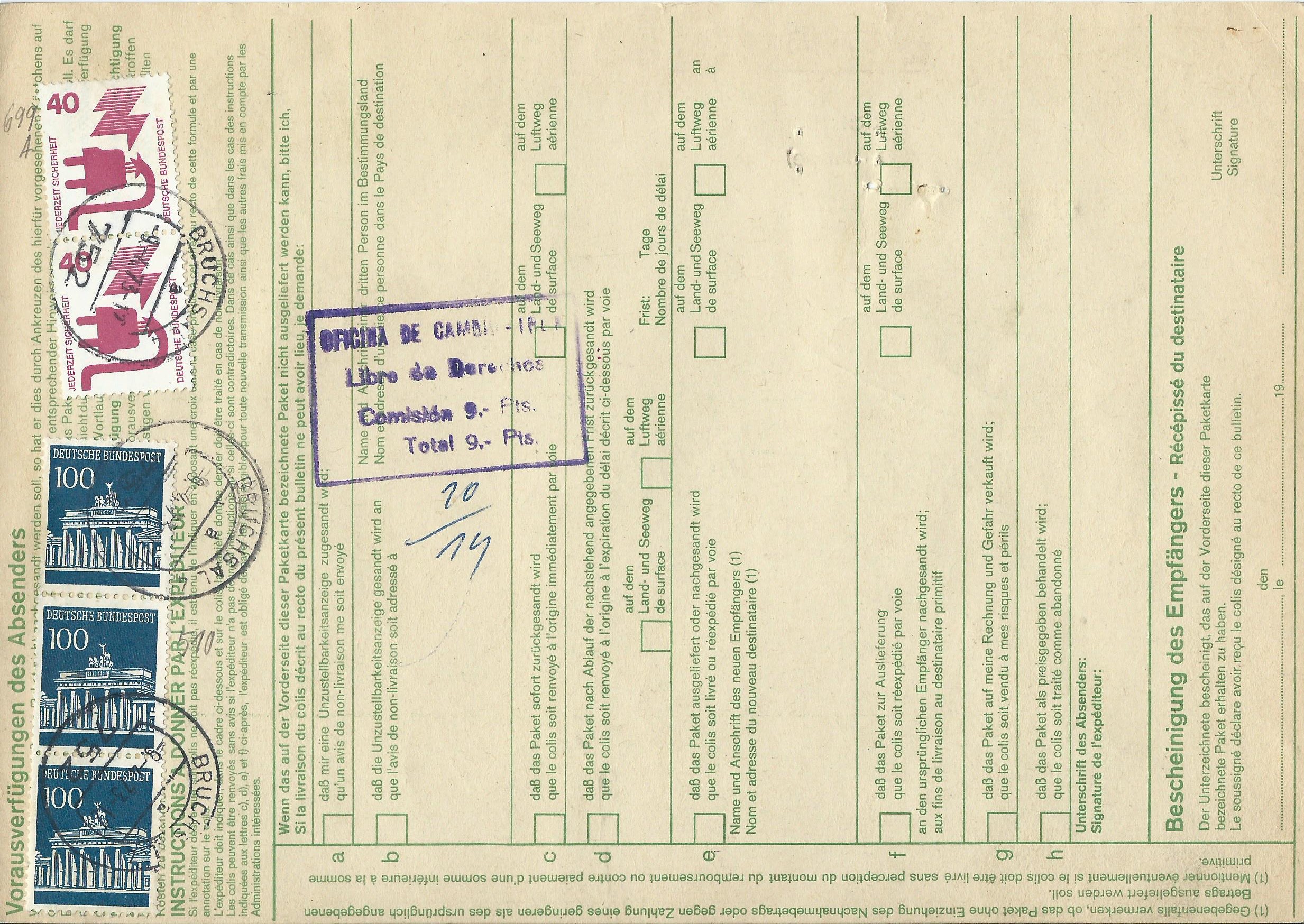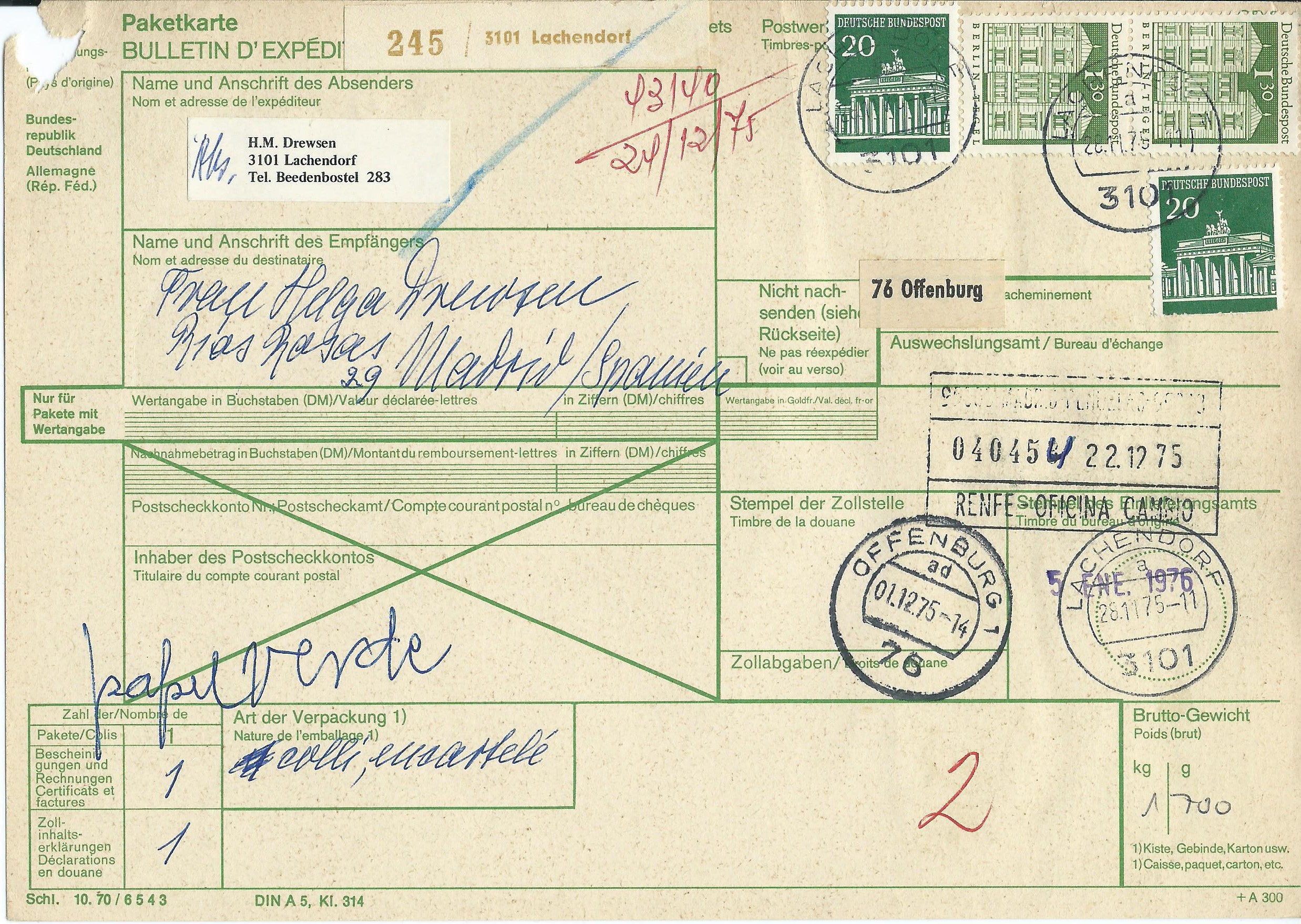 Gefolgt von einer Auslands-Paketkarte, die am 28.11.75 in Lachendorf aufgegeben wurde und nach Spanien lief. Die Frankatur hier ist ein senkrechtes Paar 130 Pf grosse Bauwerke und vorderseitig 2 Marken sowie rückseitig drei 5-er-Streifen Brandenburger Tor 20 Pf.
