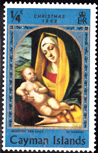 Hier eine Marke aus einer Serie Weihnachten 1969 der Kaiman-Inseln (MiNr 243) mit dem Gemälde "Madonna mit dem Kind" von Alvise Vivarini (um 1445/6 - 1503/5). Diese Marke gibt es auch noch mit drei anderen Rahmenfarben.
