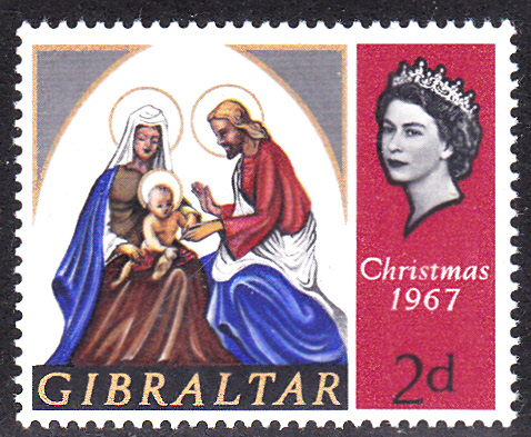 Auf einer Weihnachtsmarke aus dem Jahr 1967 aus Gibraltar (MiNr 205) wird die Heilige Familia dargestellt.