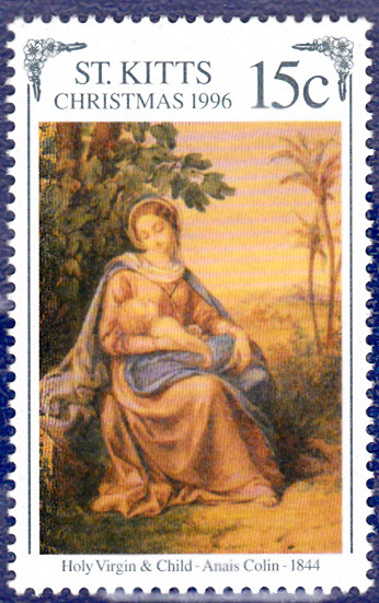 St. Kitts ist eine Insel in der Karibik, die auch unter ihrem früheren Namen Saint Christopher bekannt ist. In einer Serie mit vier Weihnachtsmarken ist 1996 auch diese Marke (MiNr 431) mit dem Aquarell "Jungfrau mit Kind" von Adèle-Anaïs Colin (1822-1899) erschienen.