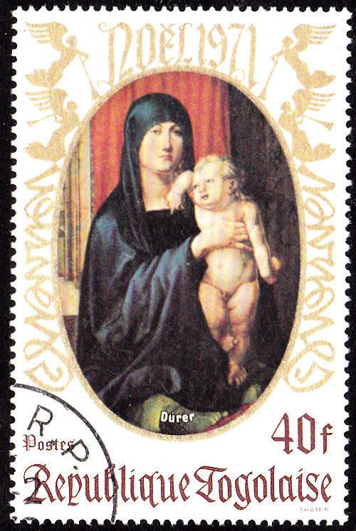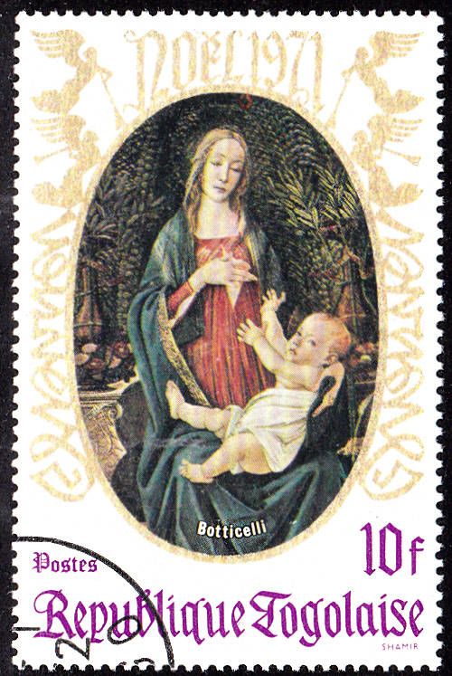 Auf den Marken einer Weihnachtsmarkenserie wurden 1971 in Togo Madonnen abgebildet. Hier die Marke zu 10F (MiNr 902 A) mit dem Gemälde "Jungfrau mit Kind" von Sandro Botticelli (1445 - 1510).